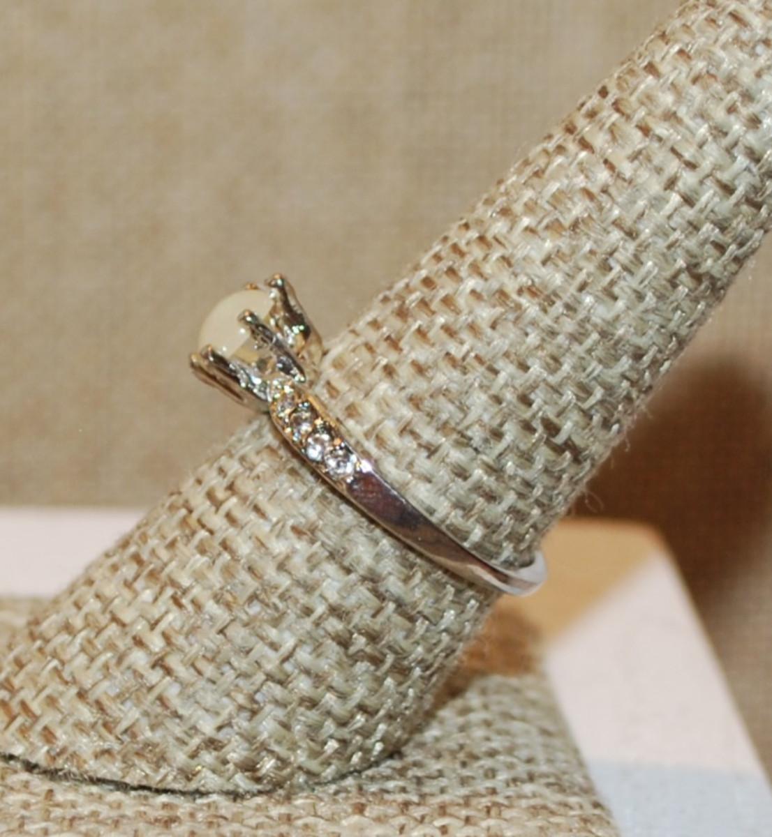 Size 8 Iridescent 6 Prong Pearl Style Ring with Side Accents on a Silver Tone Band (2.3g)