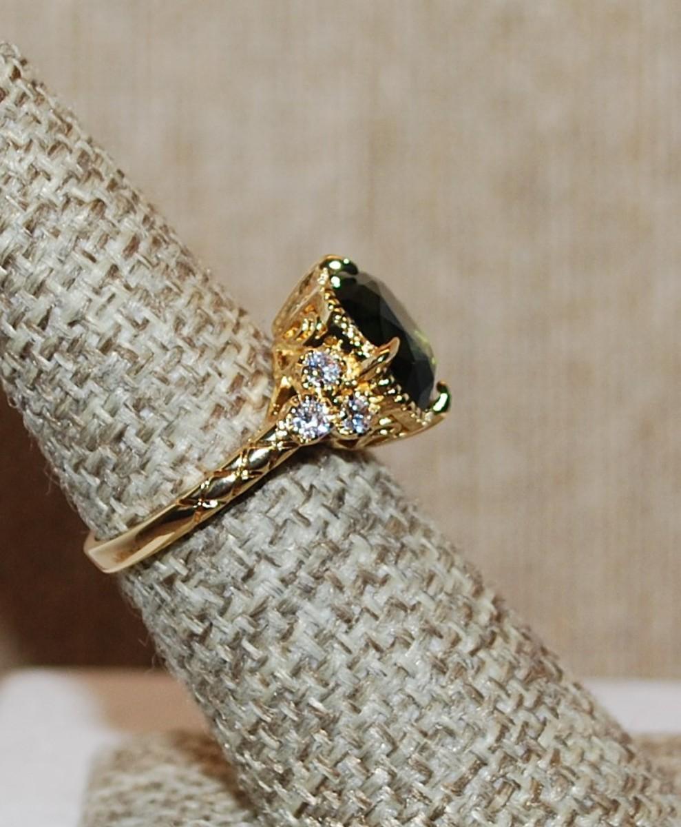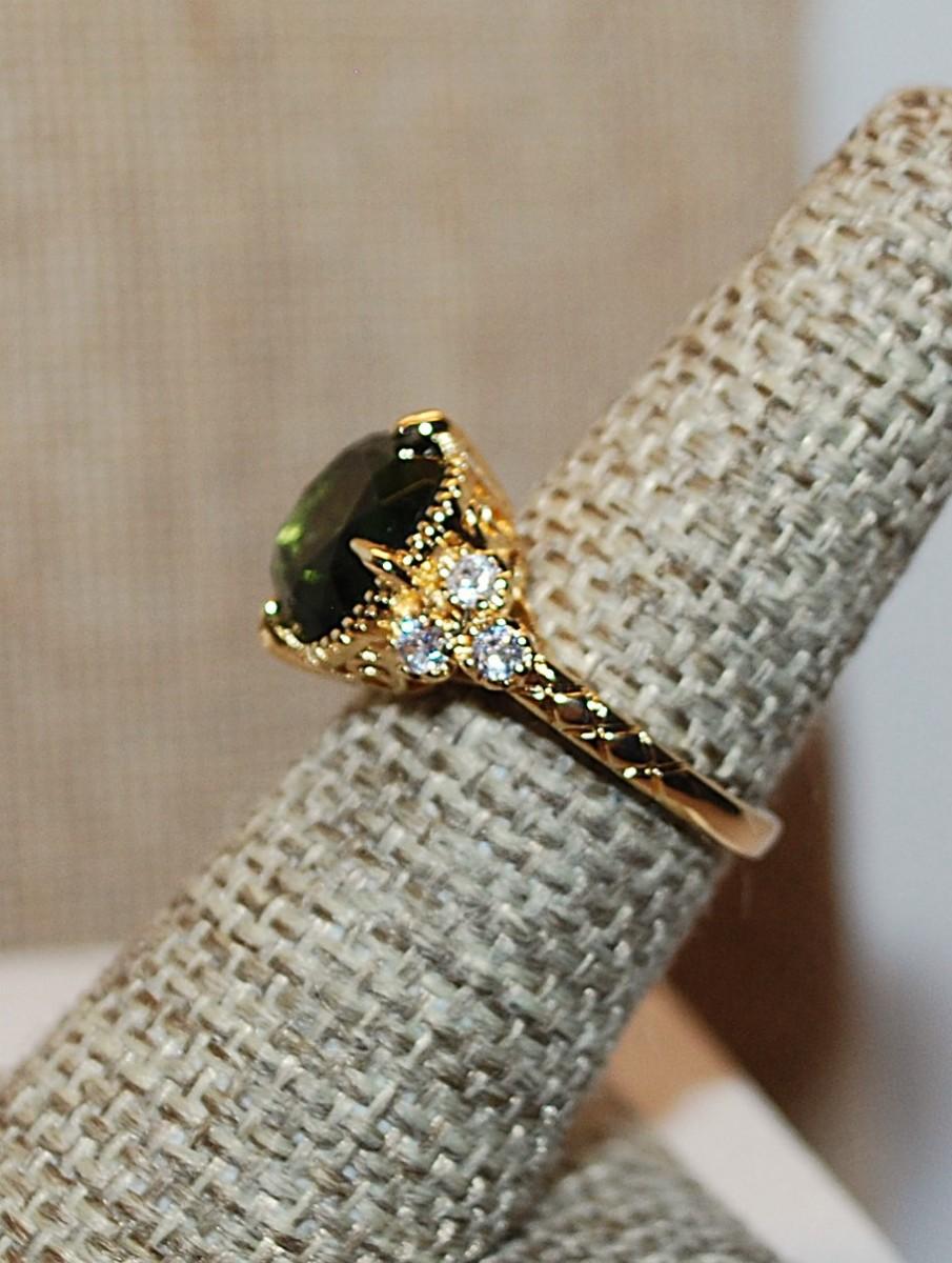 Size 8 Large Deep GREEN Beveled Stone with Gold Colored & Clear Stone Accents on a Gold Tone Band (5.0g)
