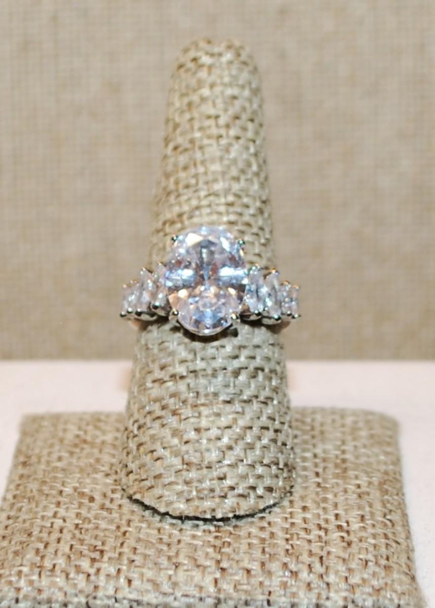 Size 8 Large Oval Clear Stone Ring with 8 Diamond Shape Side Accents on a Silver Tone Band (5.0g)
