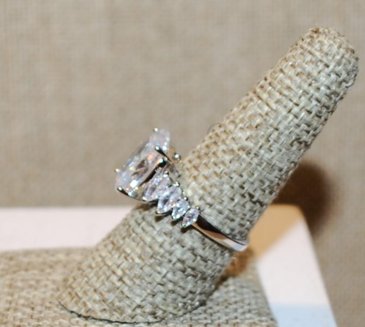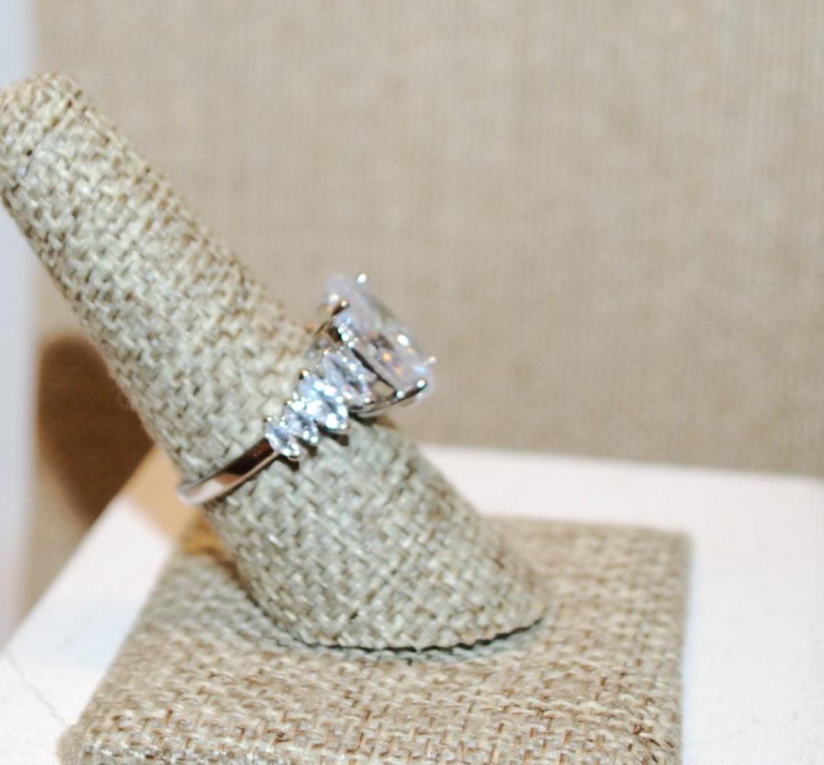 Size 8 Large Oval Clear Stone Ring with 8 Diamond Shape Side Accents on a Silver Tone Band (5.0g)