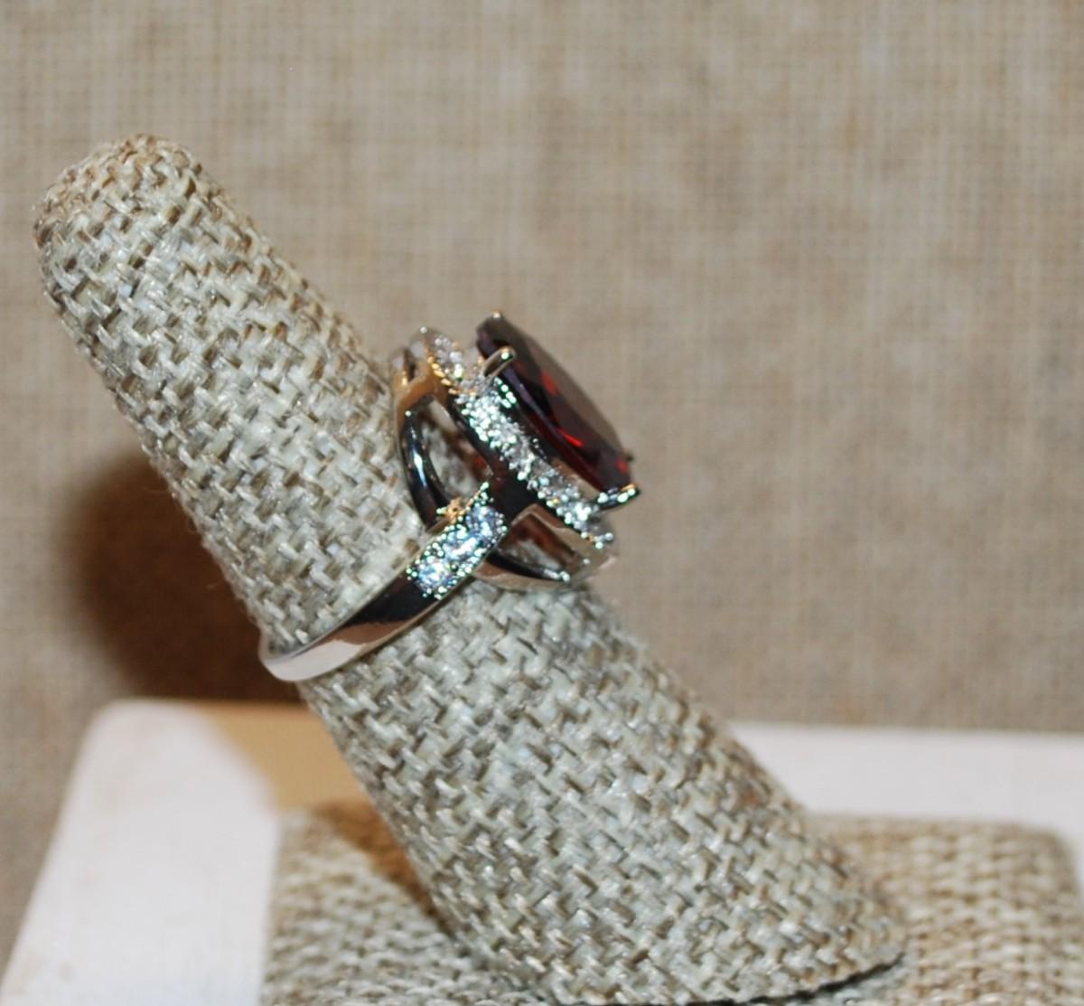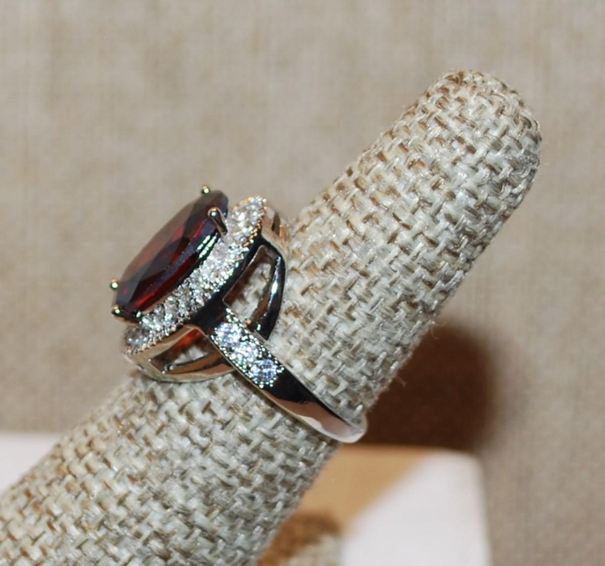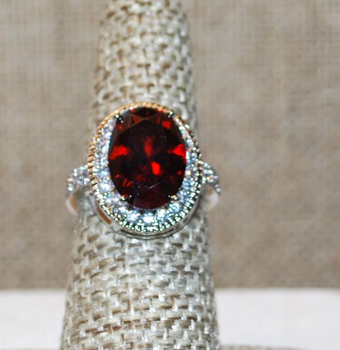 Size 8¼ Large Oval Red Faceted Stone Ring with Full Oval Surround Stones on a Silver Tone Band 4.7g)