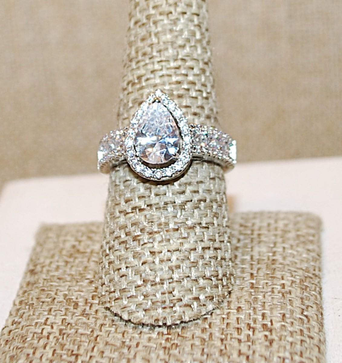 Size 8 Large PEAR Shaped Stone & Setting Ring with Side Brilliant Stone Accents on a Silver Tone Band (5.1g)