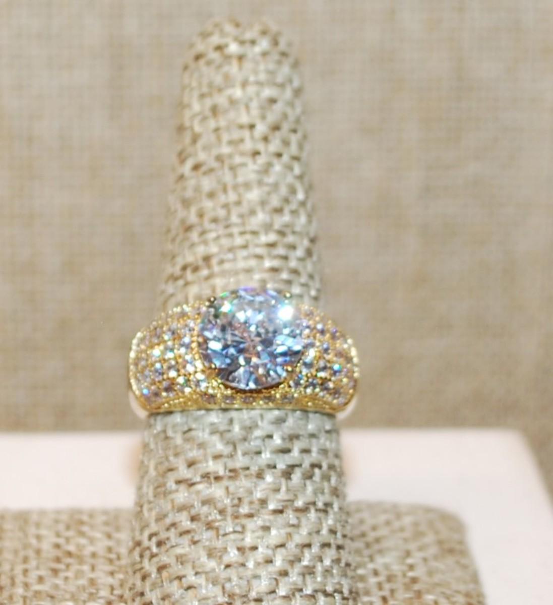Size 8¼ Large Round Clear Main Stone Ring with Glitter Stone Side Accents on a Gold Tone Band (5.5g)