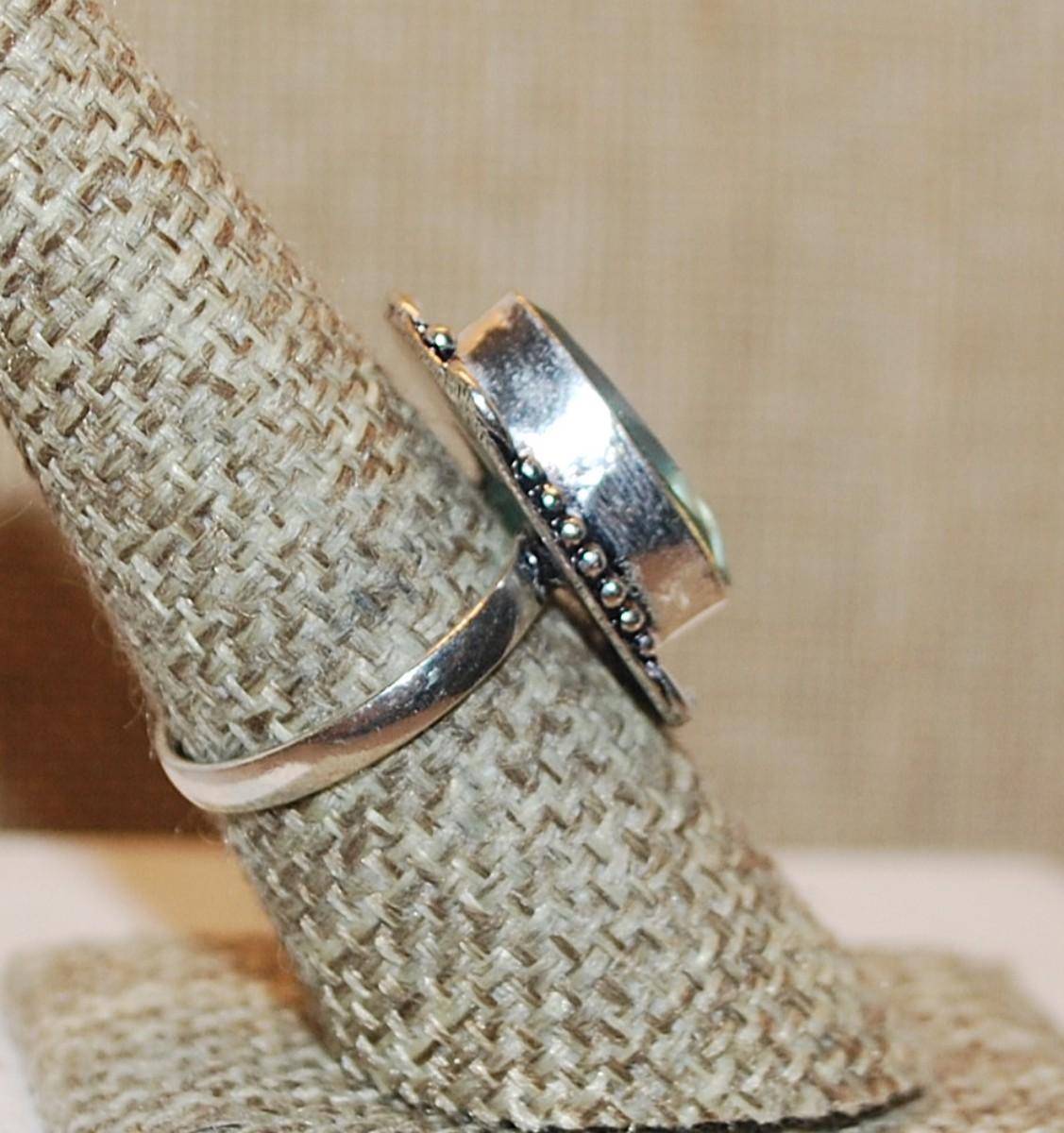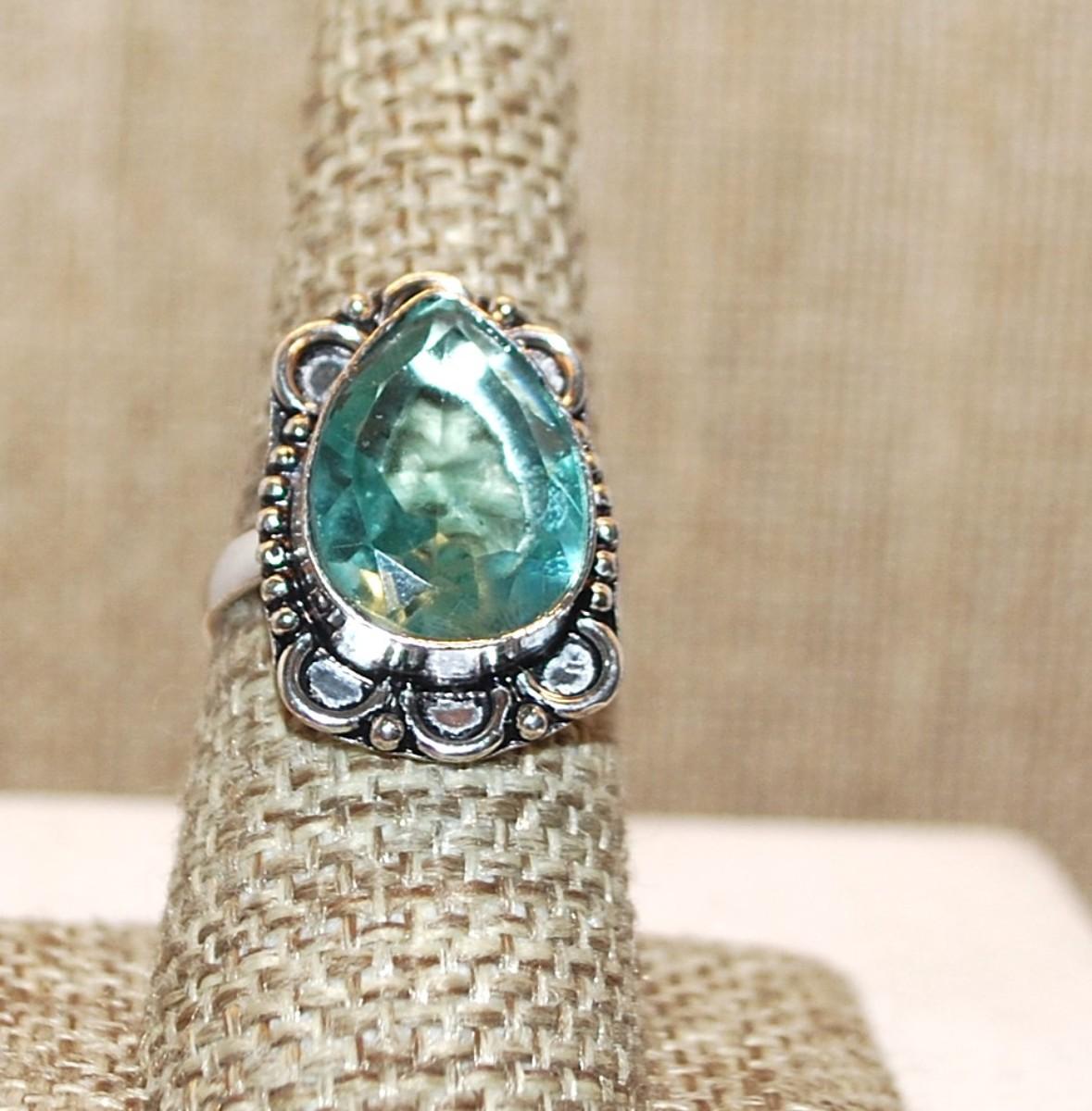 Size 8 Light GREEN Pear Shape Transparent Glass Rhinestone Ring with a 6 Loop & Side Globes Rim Setting on a Silver Tone Band (4.9g)