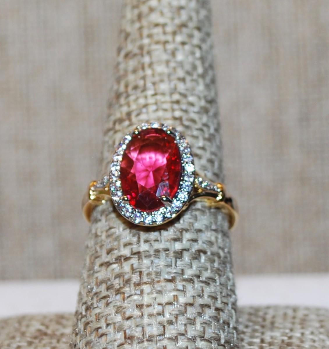 Size 8¼ Light Red Oval Cut Transparent Stone Ring with Full Clear Stones Surround and Side Accents on a Gold Tone Band (3.3g)