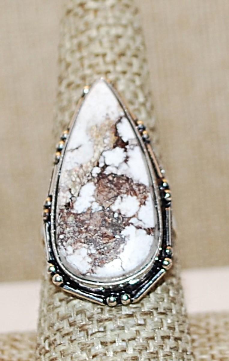 Size 8½ Long PEAR Shaped BROWNS on WHITE Colored Agate Gemstone Ring on a Silver Tone Band (7.8g)