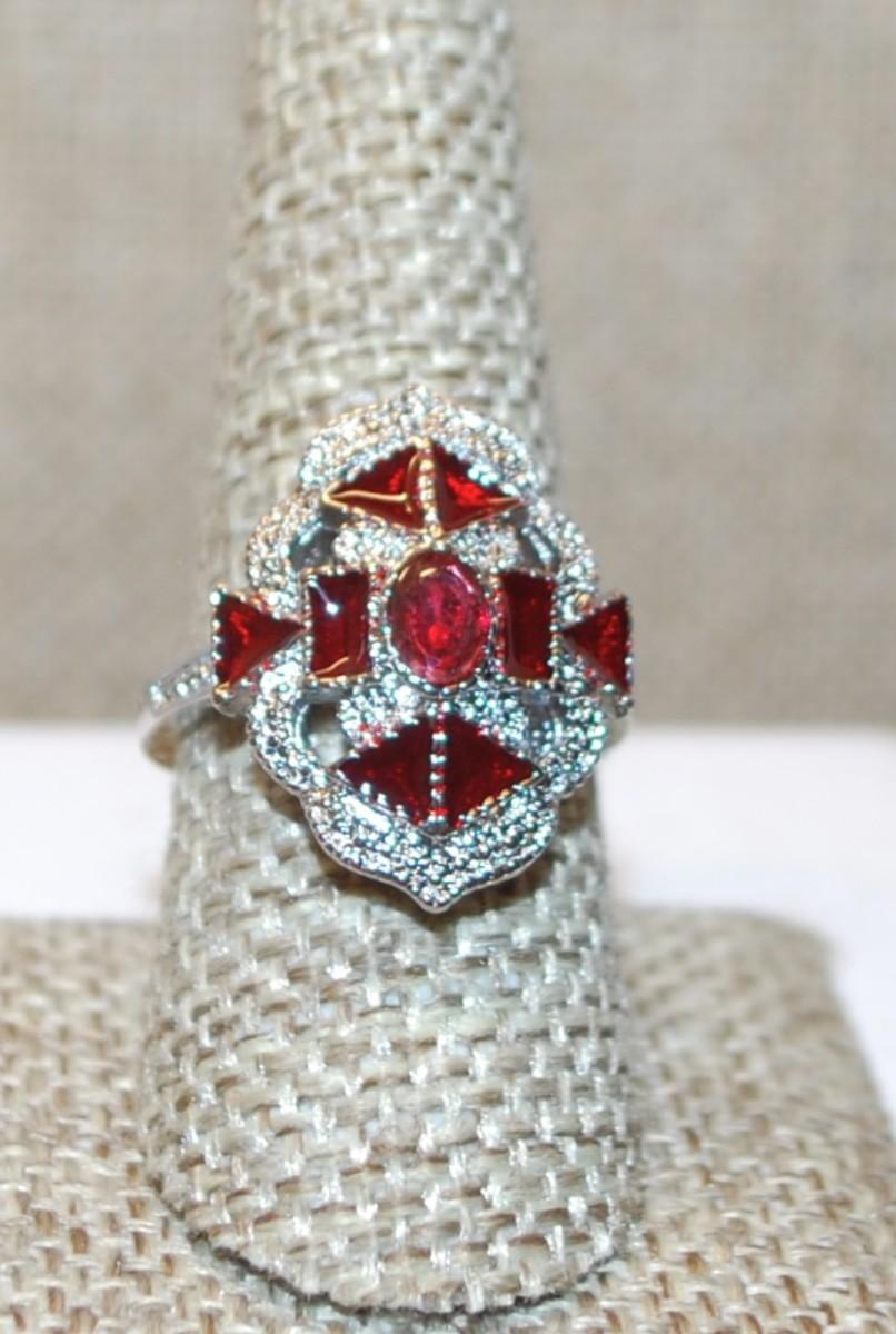 Size 8¼ Marked .925 Red Inlay Triangles Party Ring with a Glitter Setting & Silver Band (6.3g)