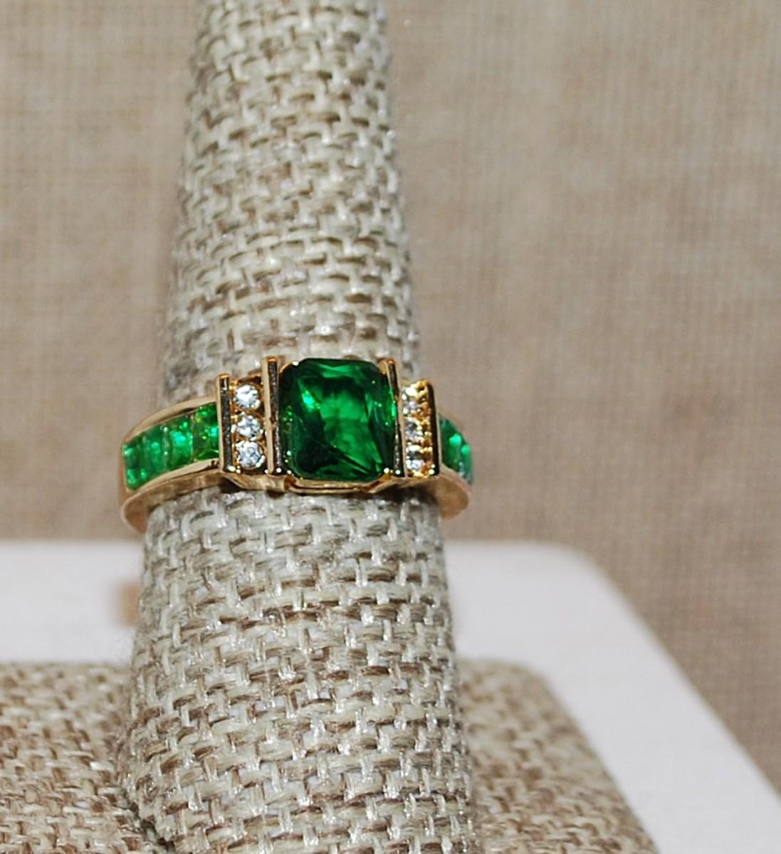 Size 8½ Marked .925 Beautiful GREEN Beveled Rectangle Stone Ring with GREEN Side "Panels" & 6 Side Clear Stone Accents on a Gold Band (5.1g)