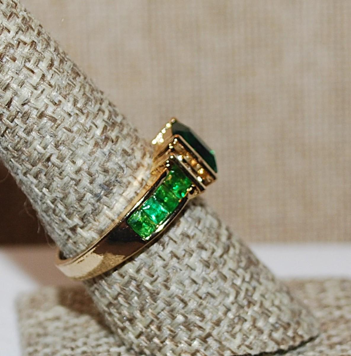 Size 8½ Marked .925 Beautiful GREEN Beveled Rectangle Stone Ring with GREEN Side "Panels" & 6 Side Clear Stone Accents on a Gold Band (5.1g)