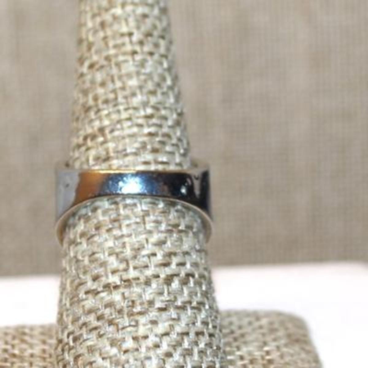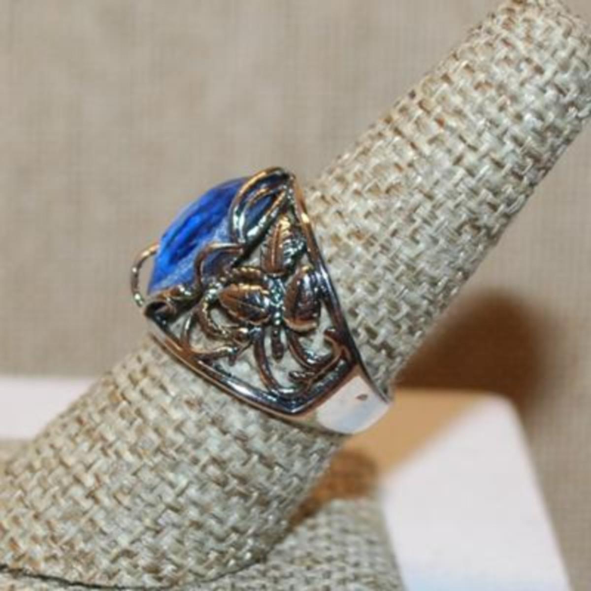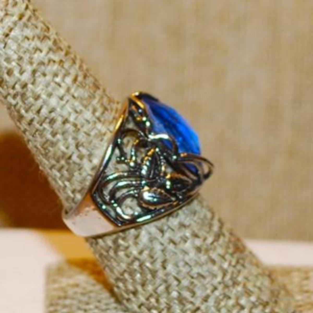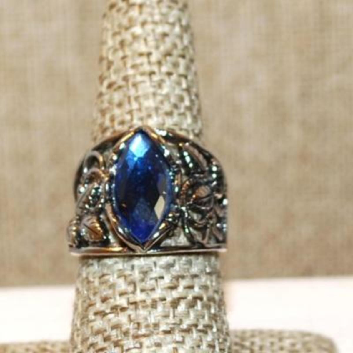 Size 8 Marked .925 Blue Pear Cut Stone Ring with a Graphic Designed Flowered Silver Band (6.3g)