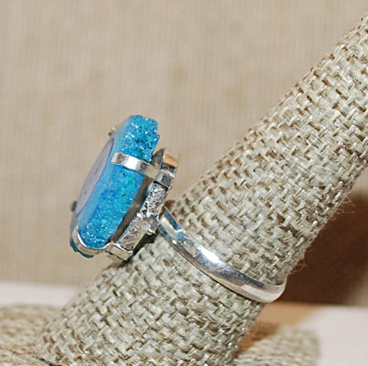 Size 8½ Marked .925 BLUE 4 Prong SOLAR QUARTZ DRUZY Gemstone Ring on a Silver-Plated Band (4.8g)