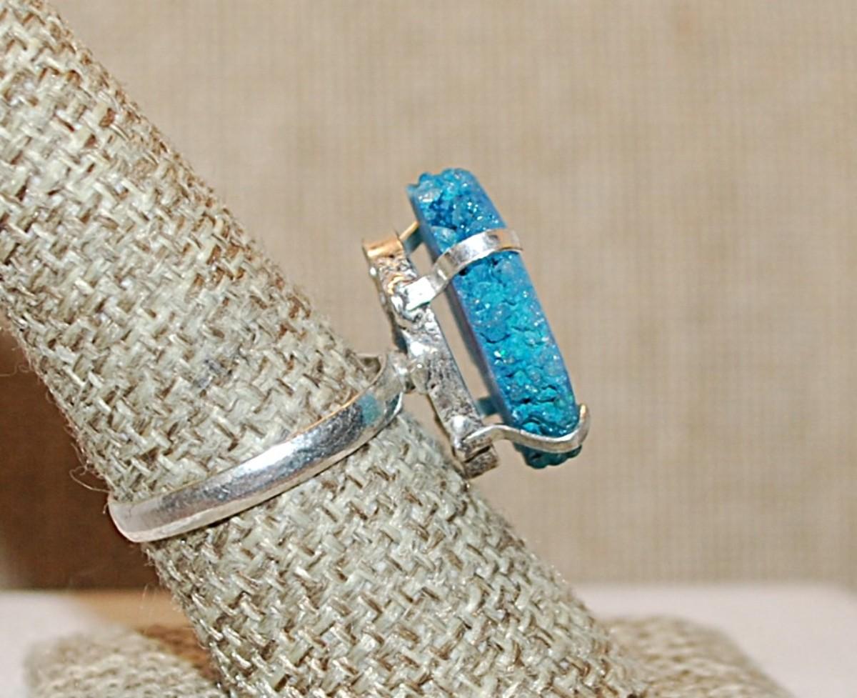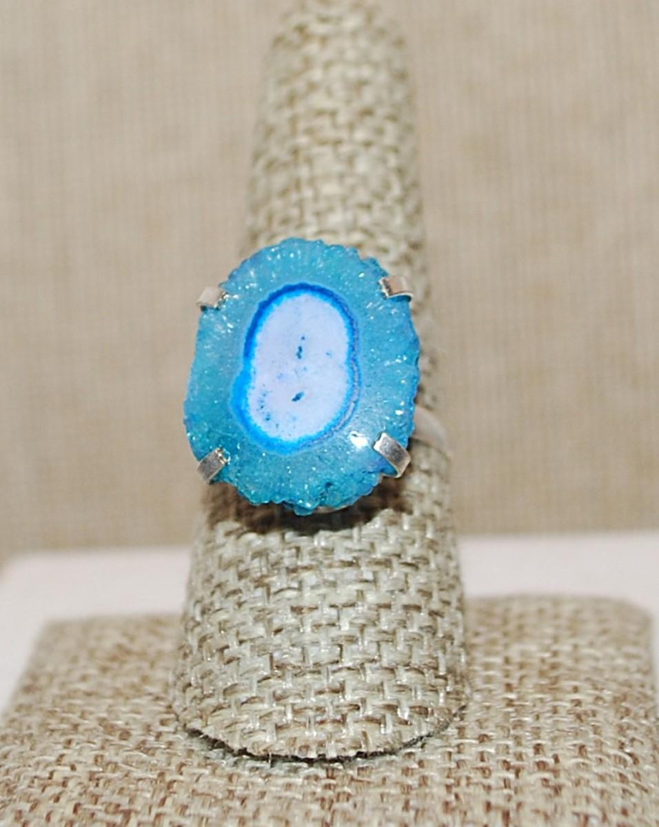 Size 8½ Marked .925 BLUE 4 Prong SOLAR QUARTZ DRUZY Gemstone Ring on a Silver-Plated Band (4.8g)