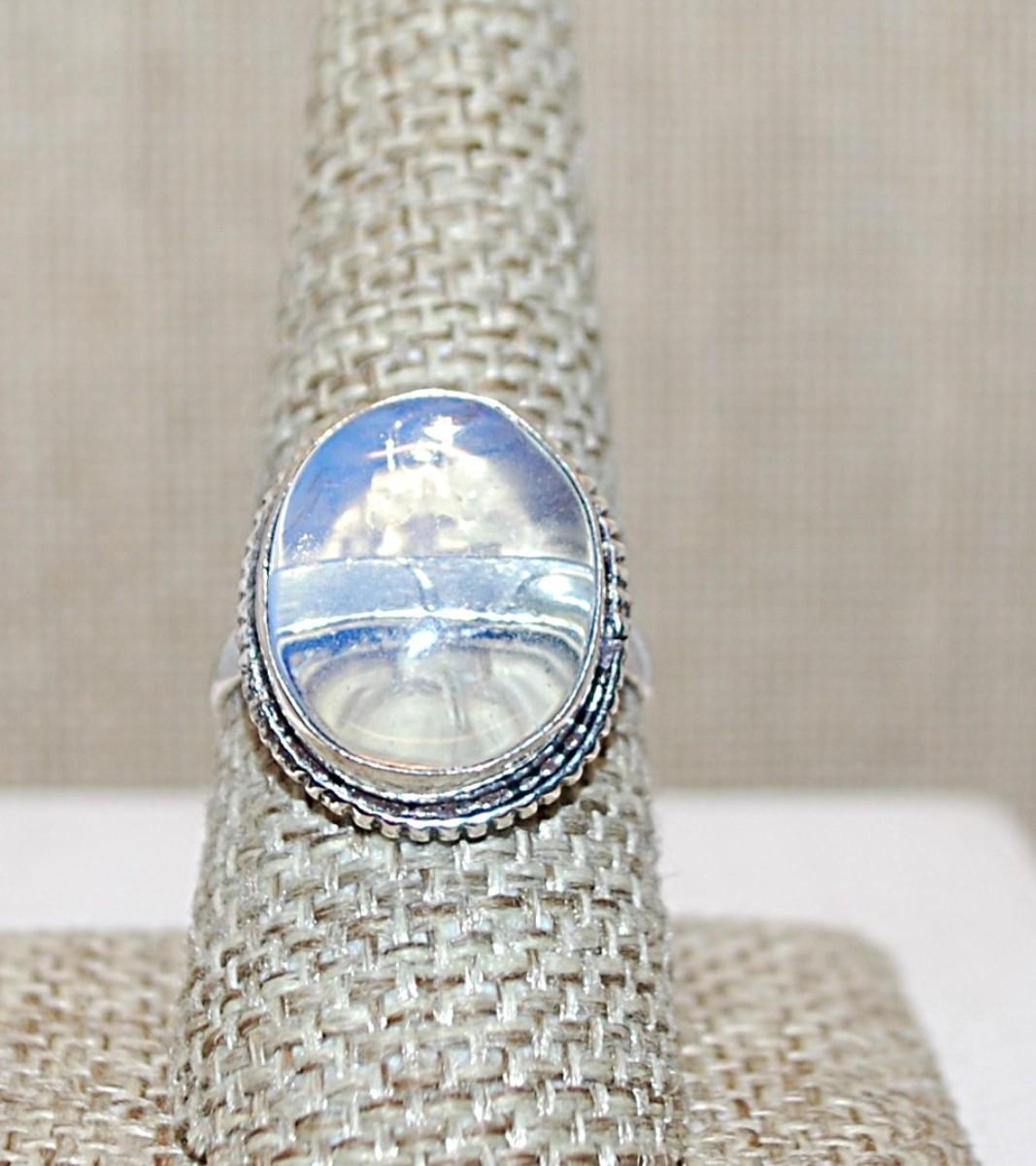 Size 8½ Marked .925 CLEAR Light Blue OPAL Style Gemstone Ring on a Silver-Plated Band (5.1g)