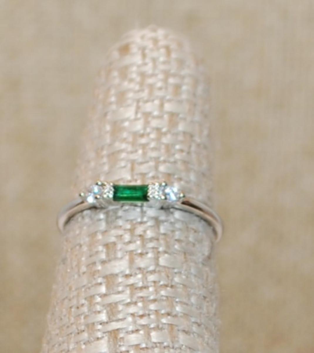 Size 8 Marked .925 Delicate Green Rectangle Stone Ring with 2 Round Clear Stone Sides on a Silver Band (1.2g)