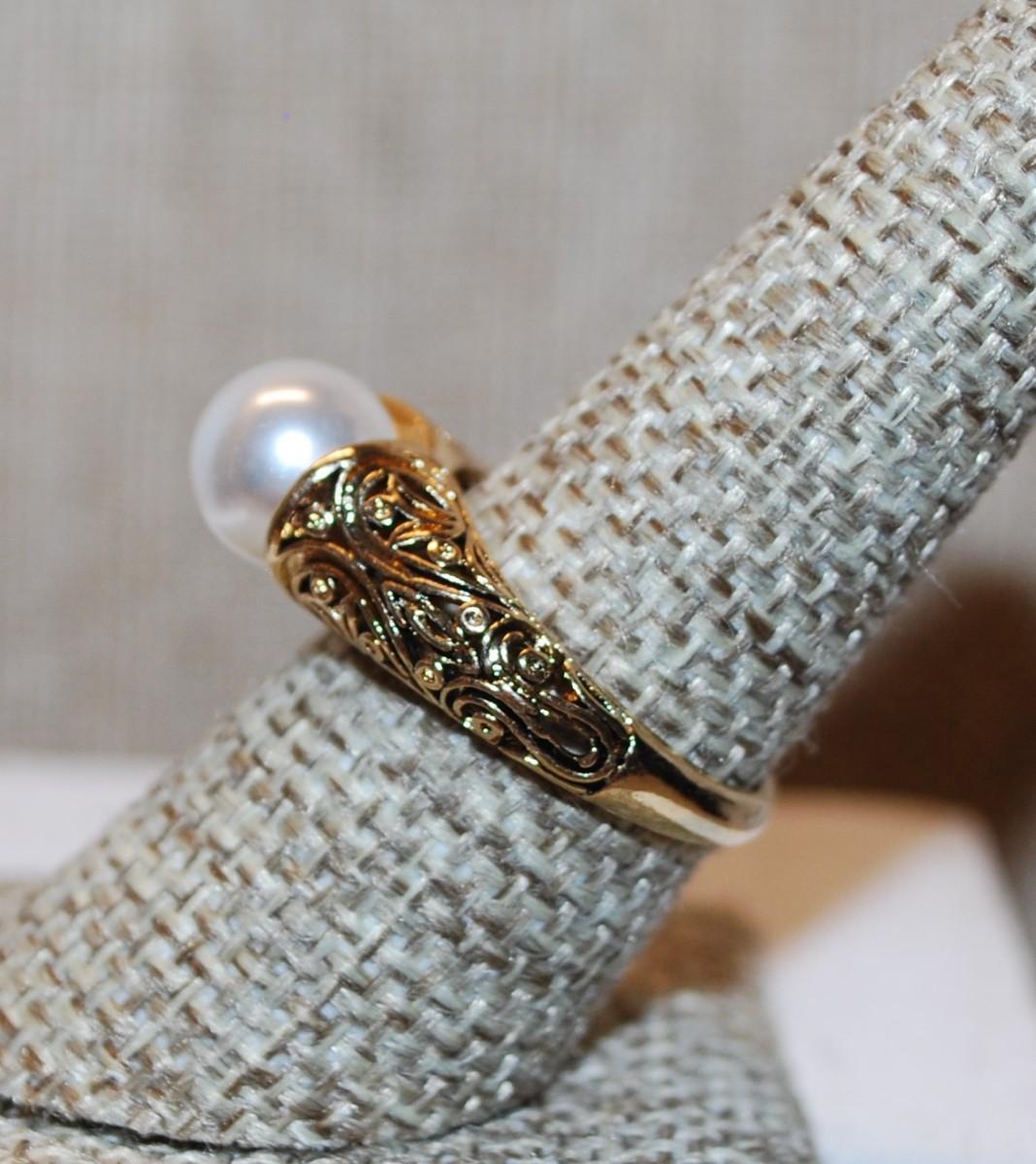 Size 8¼ Marked .925 Faux White Pearl Ring with Designed Gold Tone Band (3.6g)