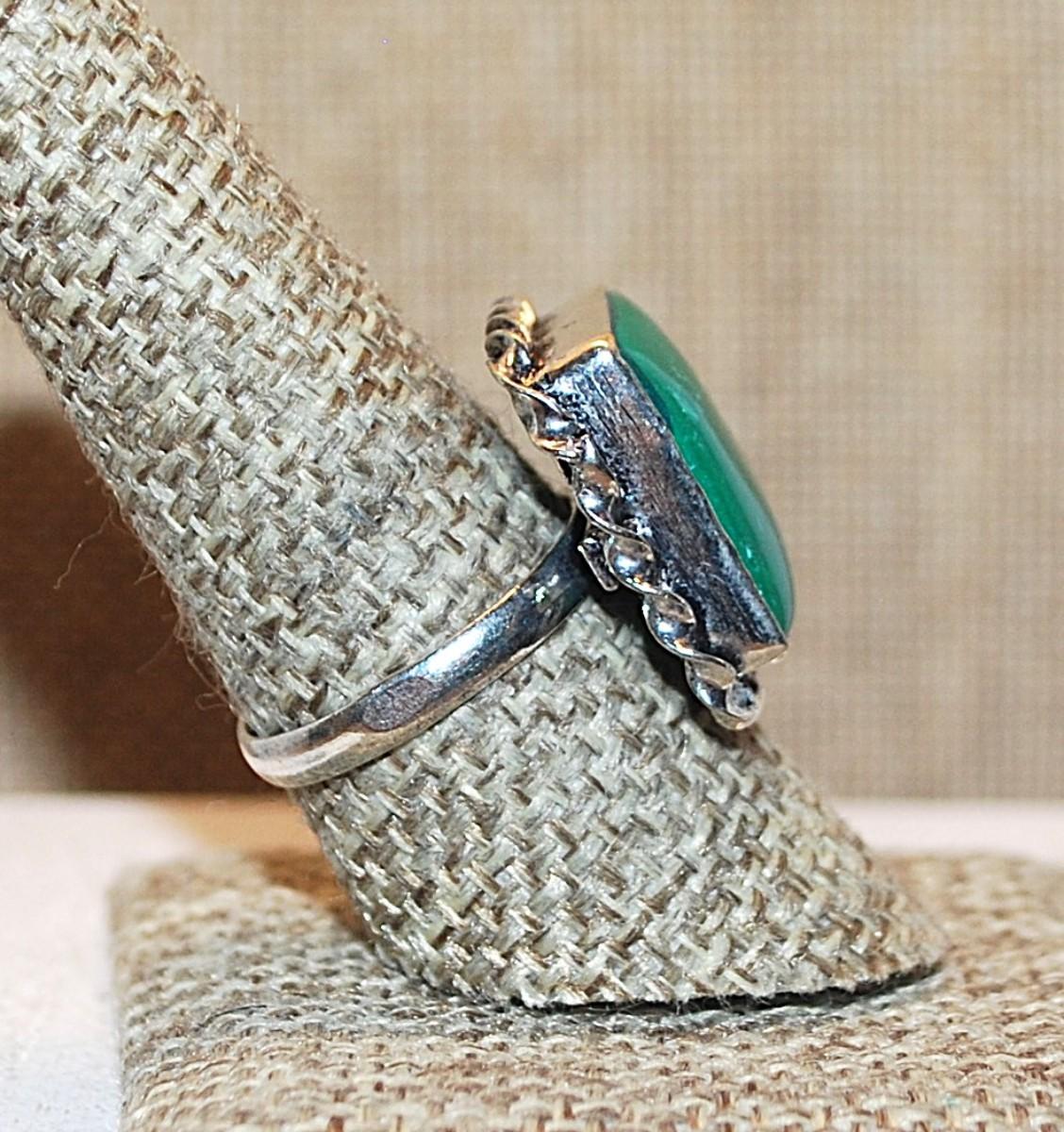 Size 8½ Marked .925 GREEN Square AGATE Gemstone Ring with Full Swirl Rope Surround on a Silver-Plated Band (6.4g)