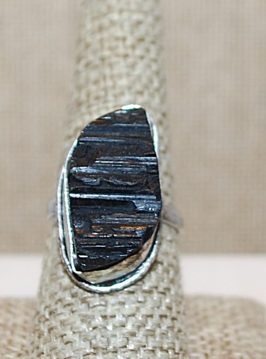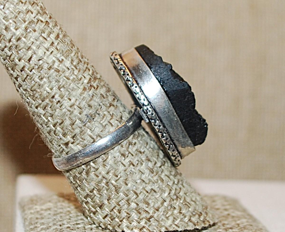 Size 8½ Marked .925 Irregular Shaped Long Rectangle BLACK TITANIUM Gemstone Ring on a Silver-Plated Band (8.3g)