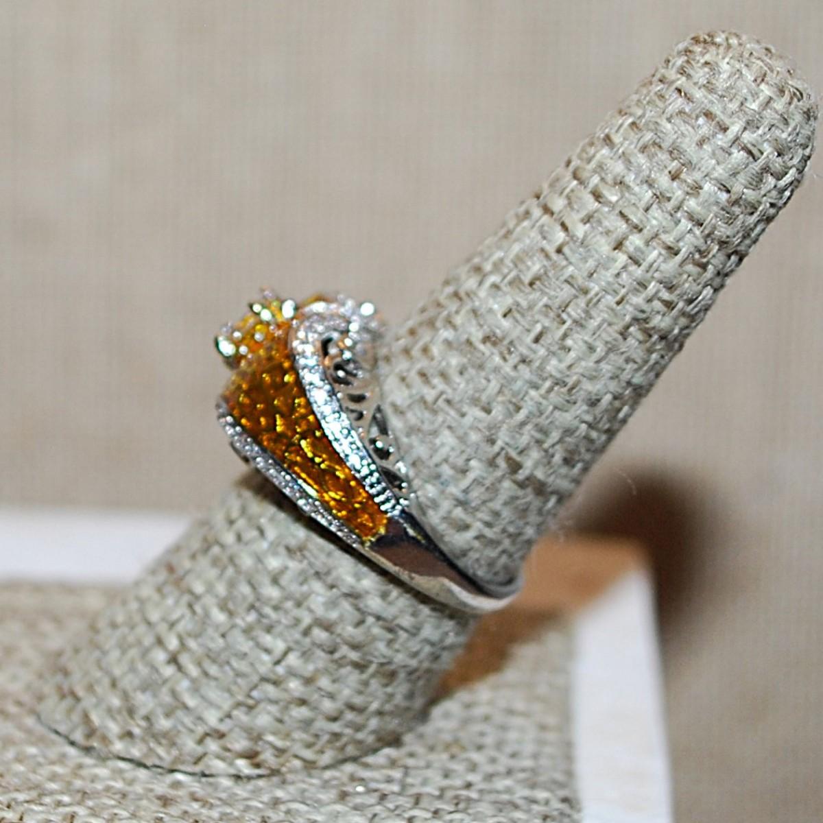 Size 8 Marked .925 "Puffy" AMBER Party Ring with a Single Main Clear Round Stone on a Silver Band (5.8g)
