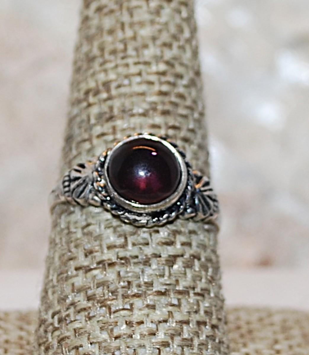 Size 8¾ Marked .925 Translucent PURPLE Cabochon Stone Ring with Rope Surround & Triple Knob Accents on a Silver Band (2.2g)