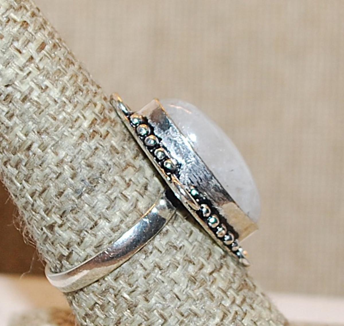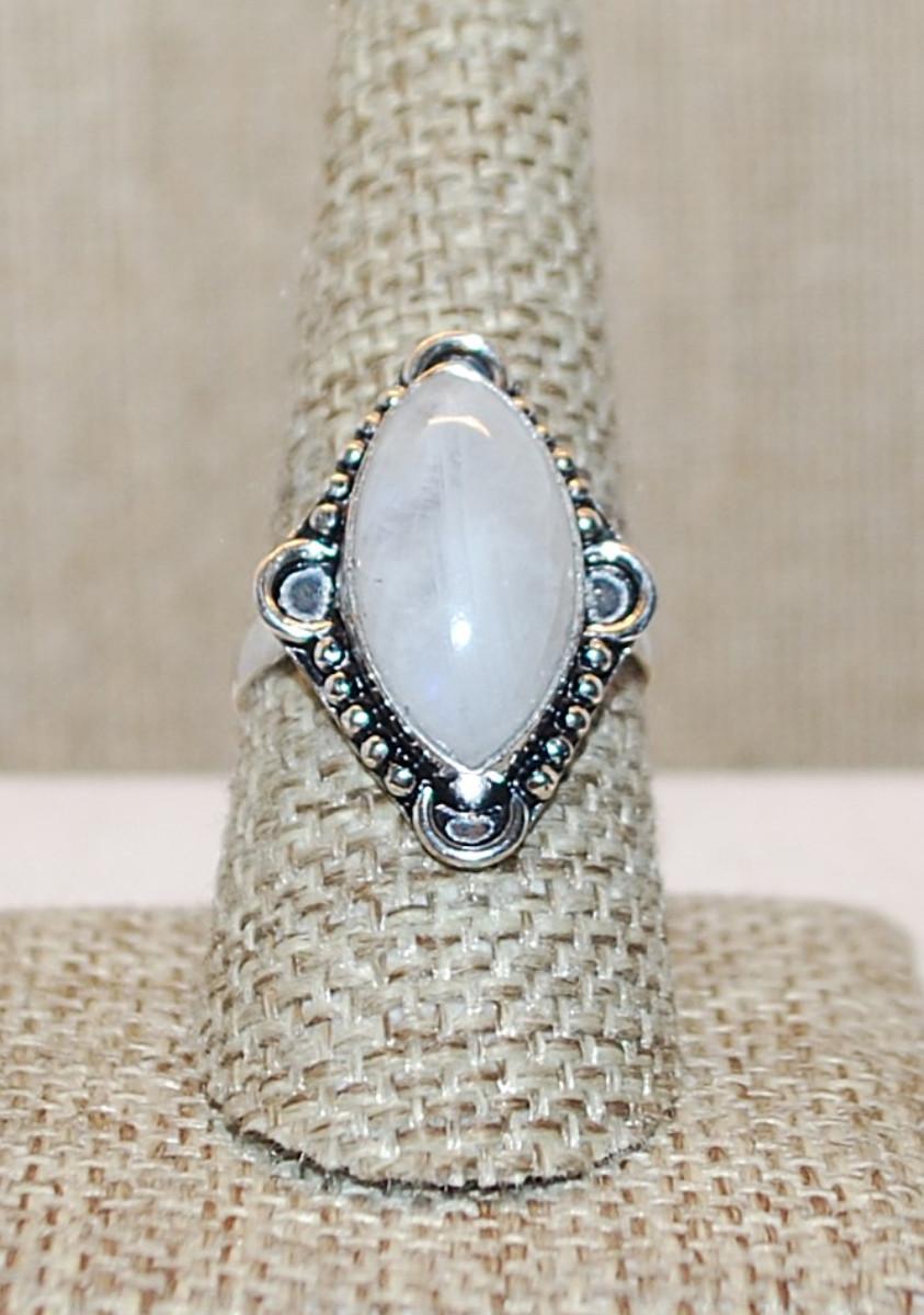Size 8½ Marquise Cut WHITE MOONSTONE Gemstone Ring with 4 Loops Surround on a Silver Tone Band (5.4g)