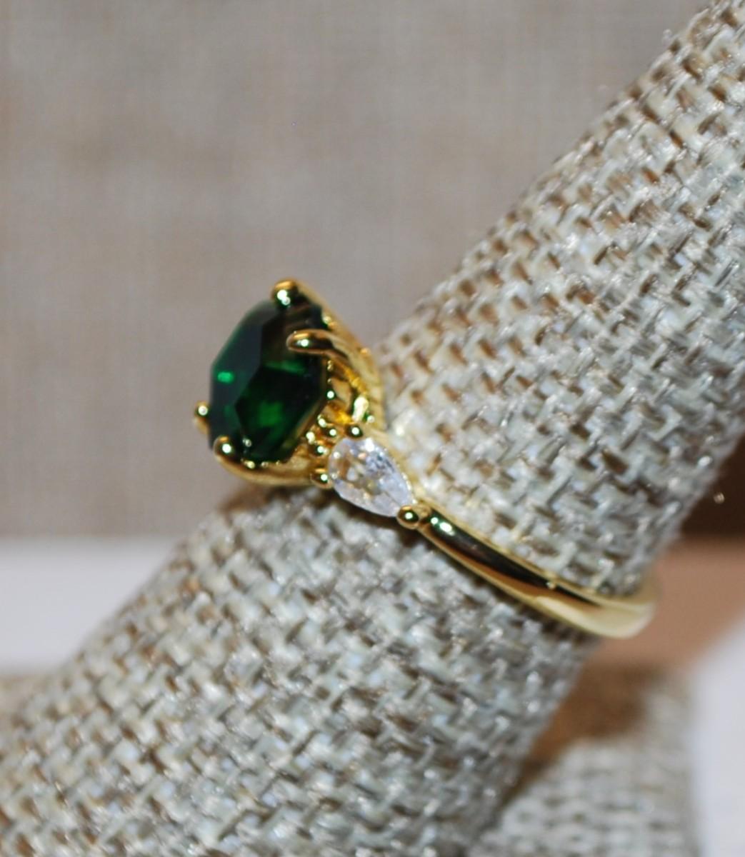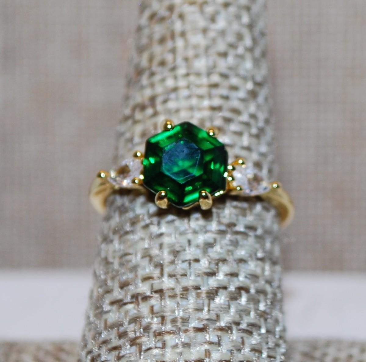 Size 8 Nice Hexagon Deep Green Center Stone with Side Clear Stone Accents Ring on a Gold Tone Band (2.6g)