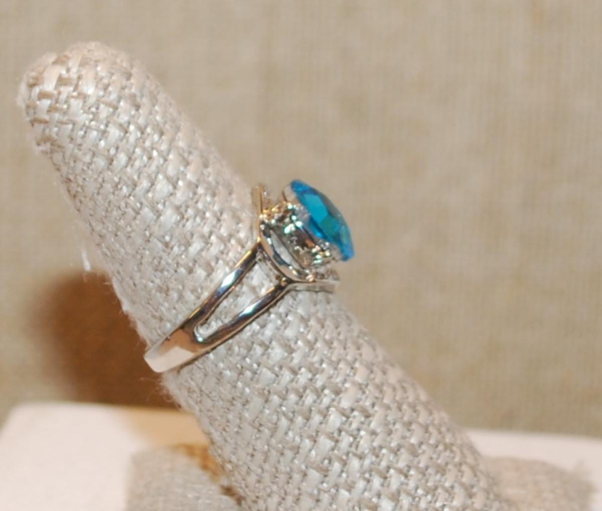 Size 8 Oval Blue Main Stone Ring with Top & Bottom Clear Stone Accents on a Silver Tone Band (3.6g)
