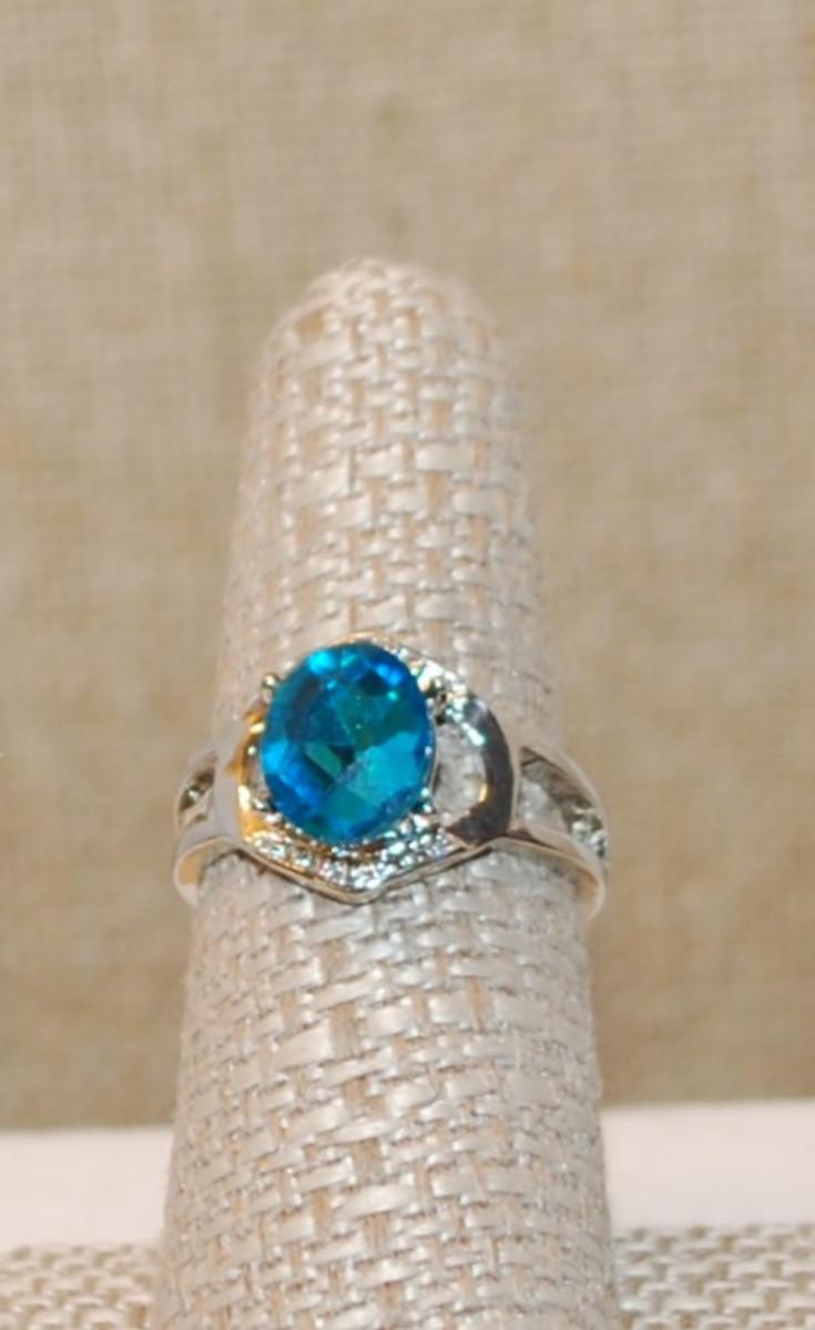Size 8 Oval Blue Main Stone Ring with Top & Bottom Clear Stone Accents on a Silver Tone Band (3.6g)