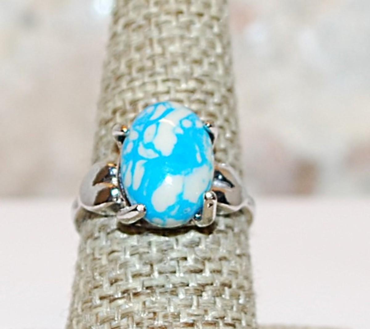 Size 8 Oval Blue & White "Clouds" RING with Oval Stone on a Silver Tone Setting (3.7g)