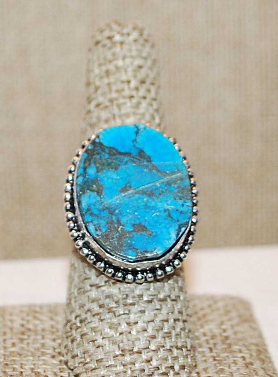 Size 8½ Oval BLUES & BROWNS Colored AGATE Gemstone Ring with a Full Rope Surround on a Silver Tone Band (8.8g)