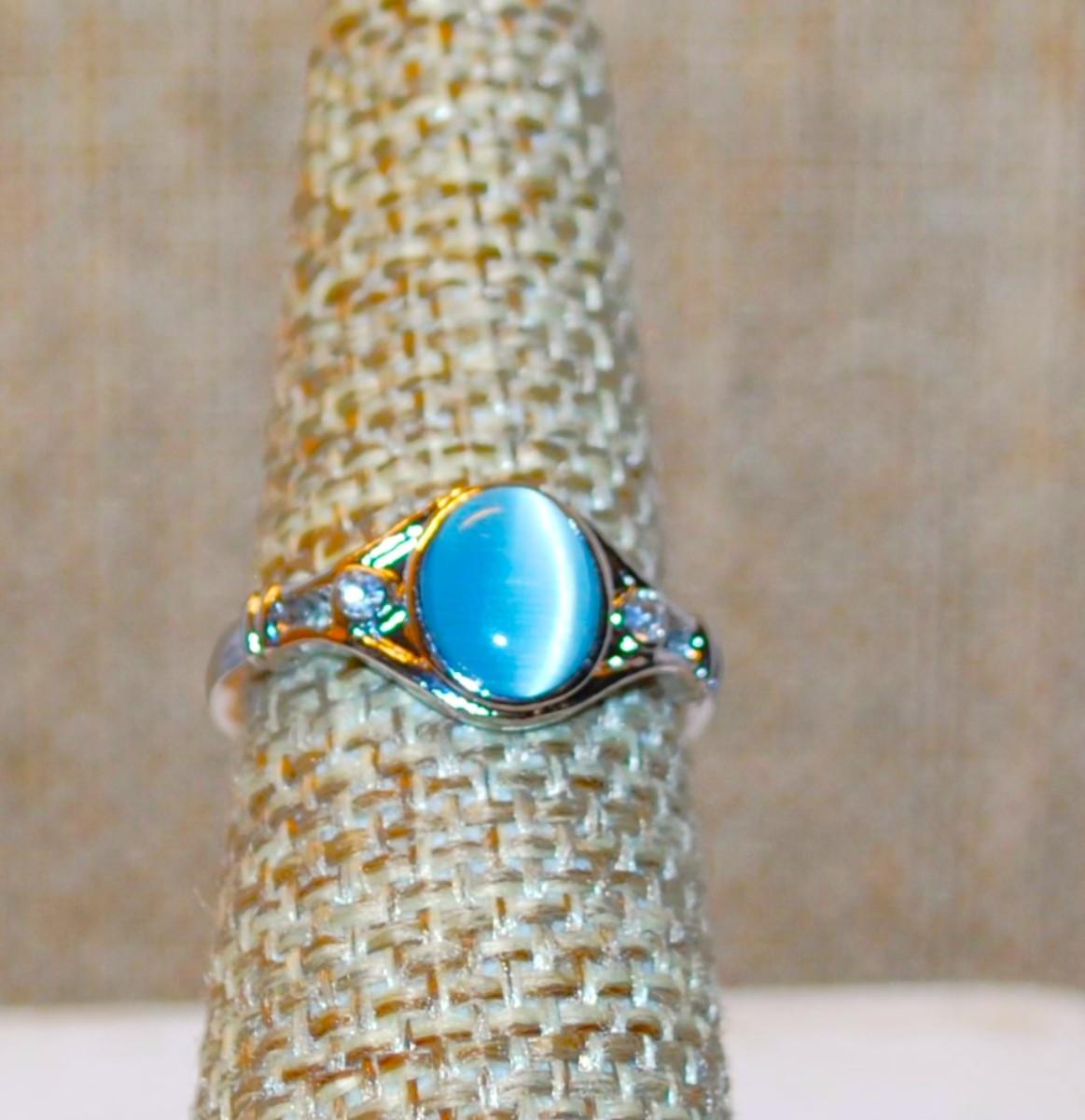 Size 8½ Oval Light Blue Iridescent Reflecting Stone Ring with Single Stone Side Accents on a Silver Tone Band (3.1g)