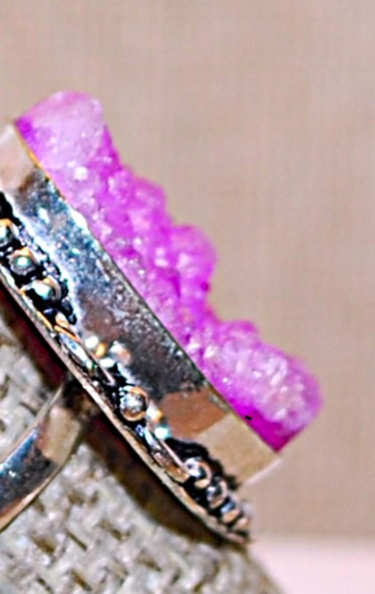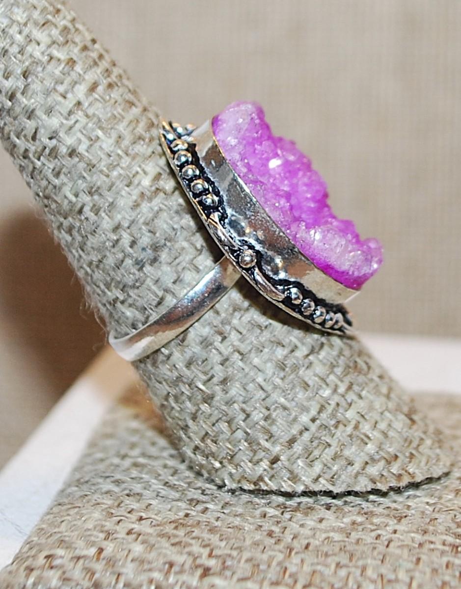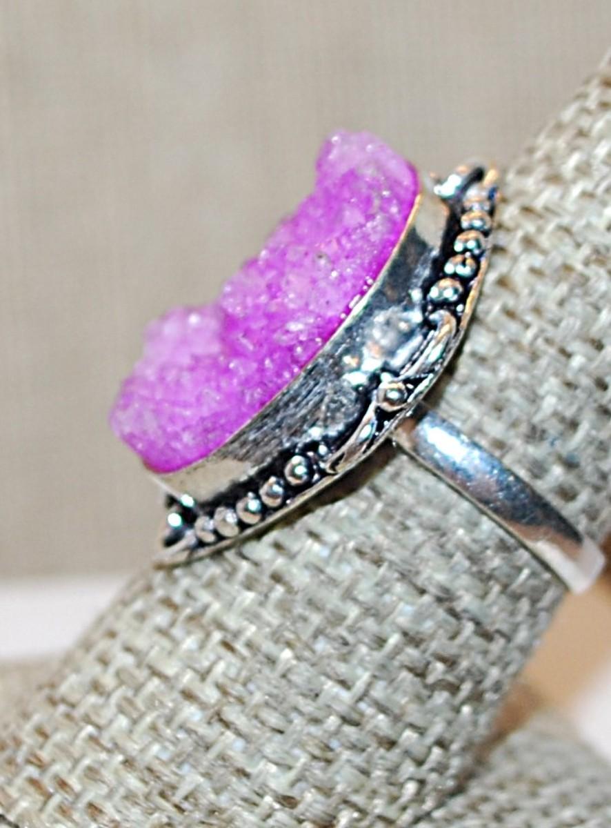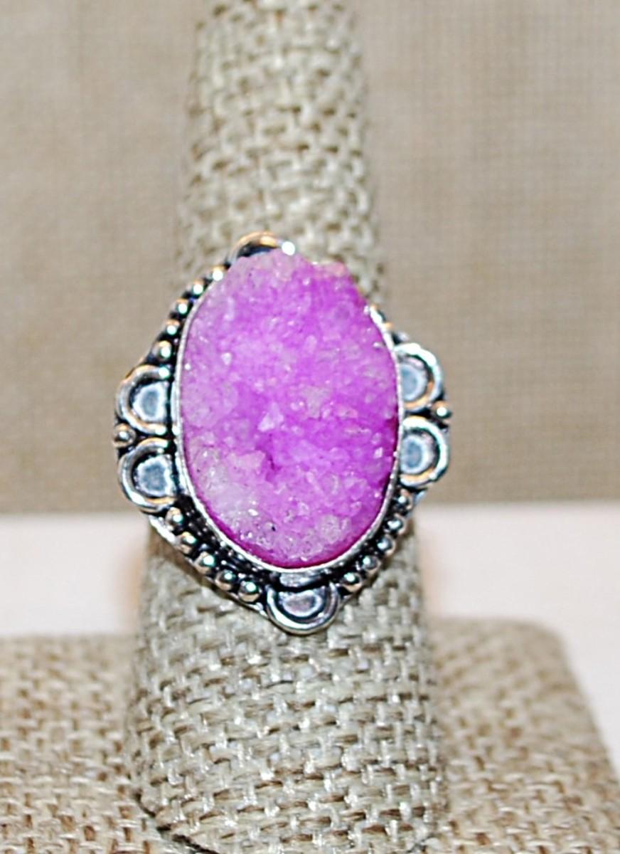 Size 8½ Oval PINK Rough-Cut Quartz Gemstone Ring with a 6 Loop Surround on a Silver Tone Band (7.2g)