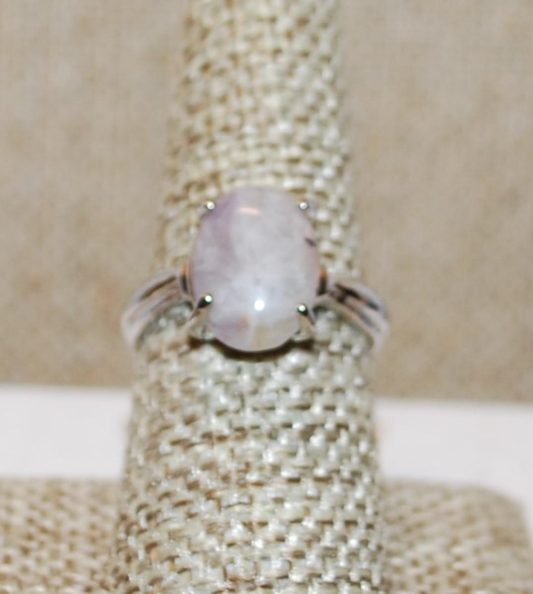 Size 8 Oval Pinkish 4 Prong Rose Quartz Stone Ring on a Silver Tone Band (3.7g)