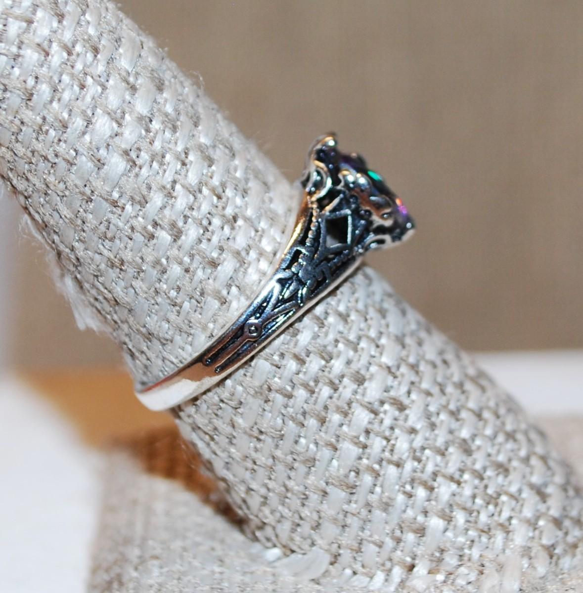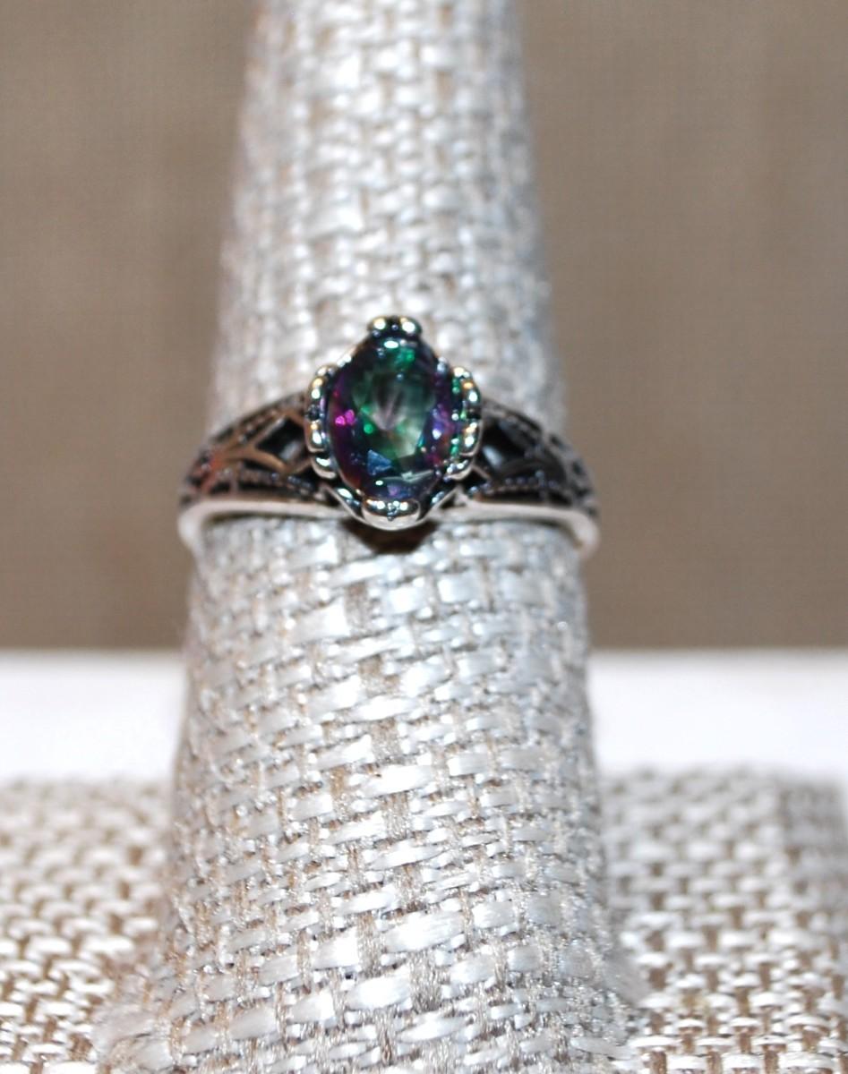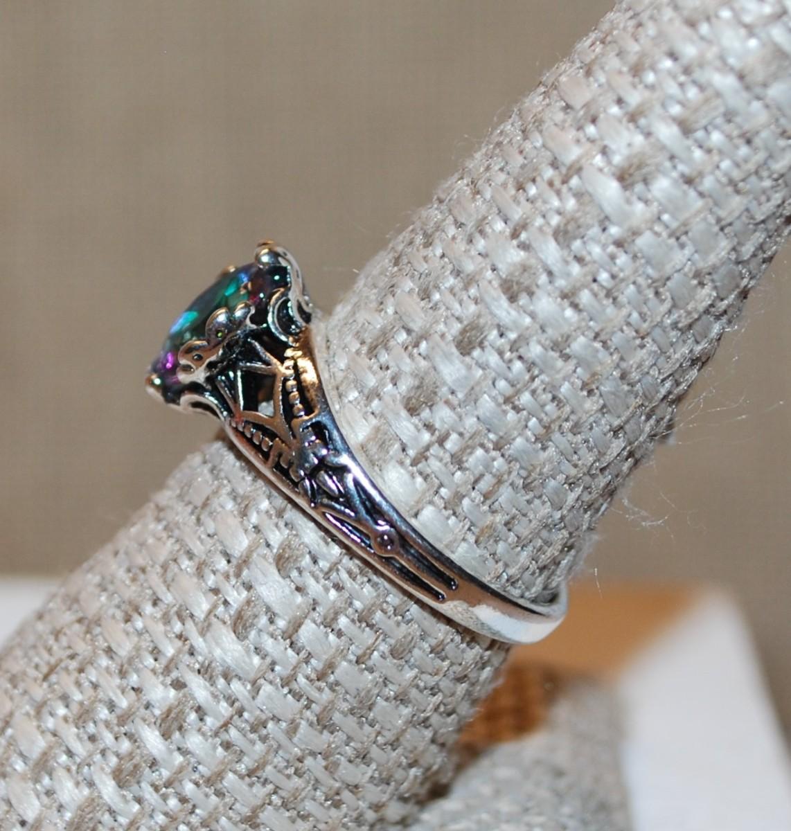 Size 8¾ Oval Shaped Green/Purple Iridescent Stone Ring on a Silver Tone Band (2.7g)