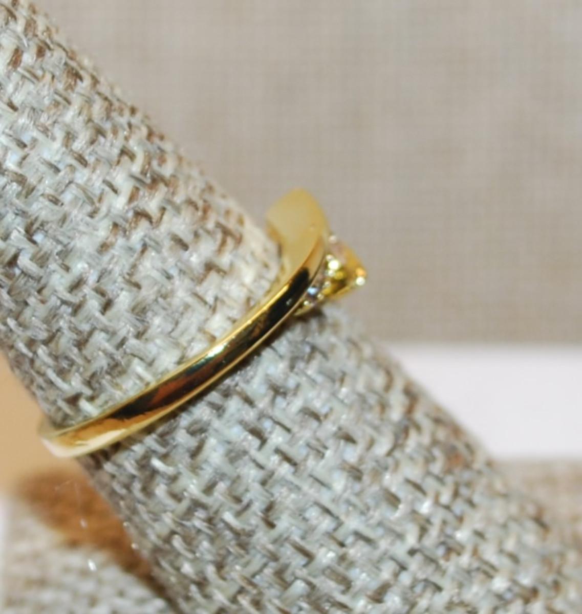 Size 8 Overlap Style Setting Ring with Small Main Stone & Side Accents on a Gold Tone Band (2.2g)