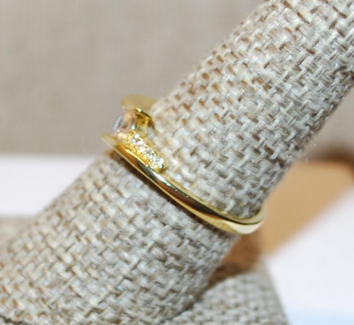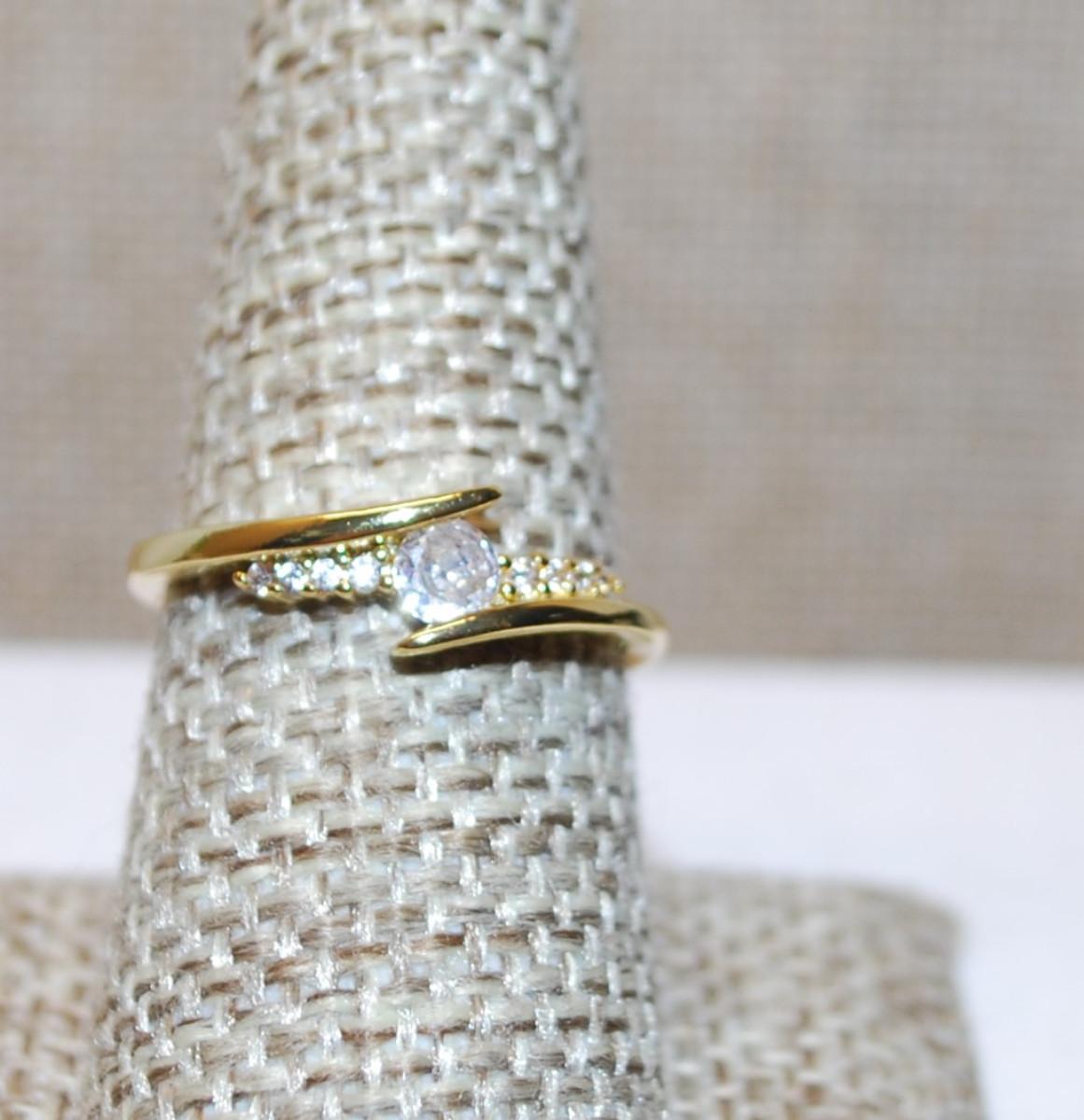 Size 8 Overlap Style Setting Ring with Small Main Stone & Side Accents on a Gold Tone Band (2.2g)