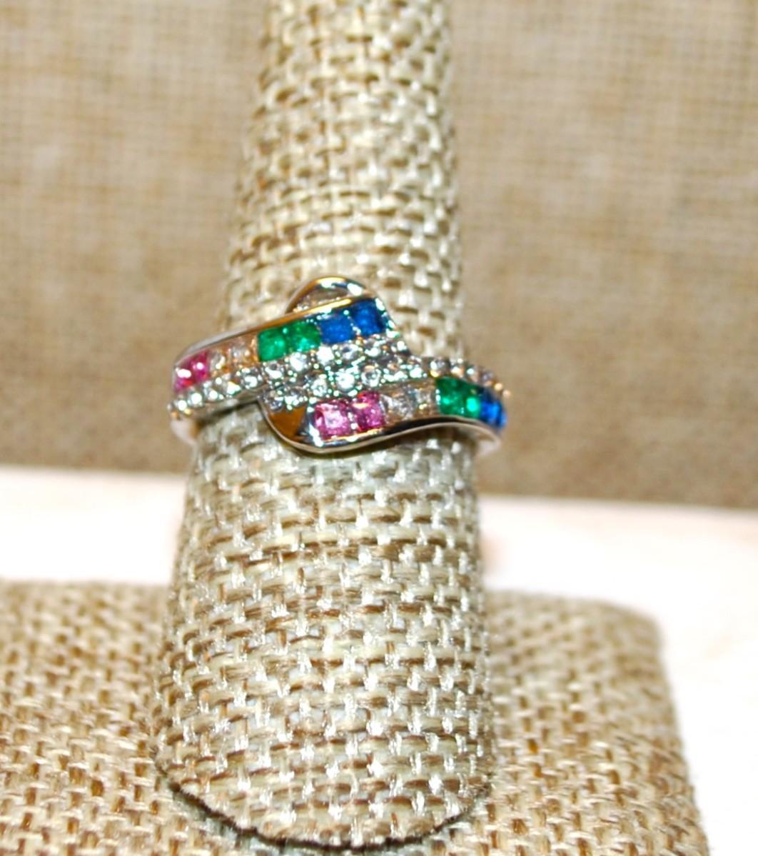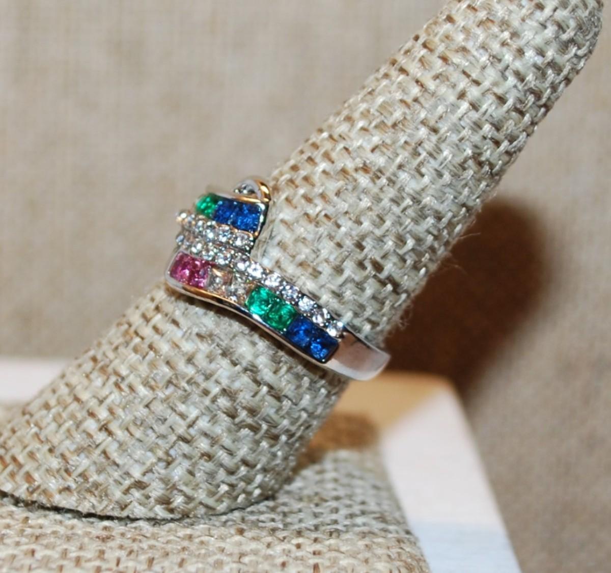 Size 8 Overlapping Pink, Green, Blue & Clear Stones Ring with a Silver Tone Band (4.6g)