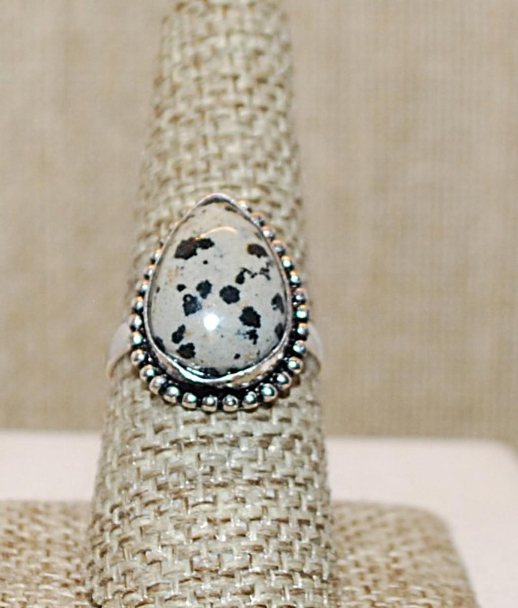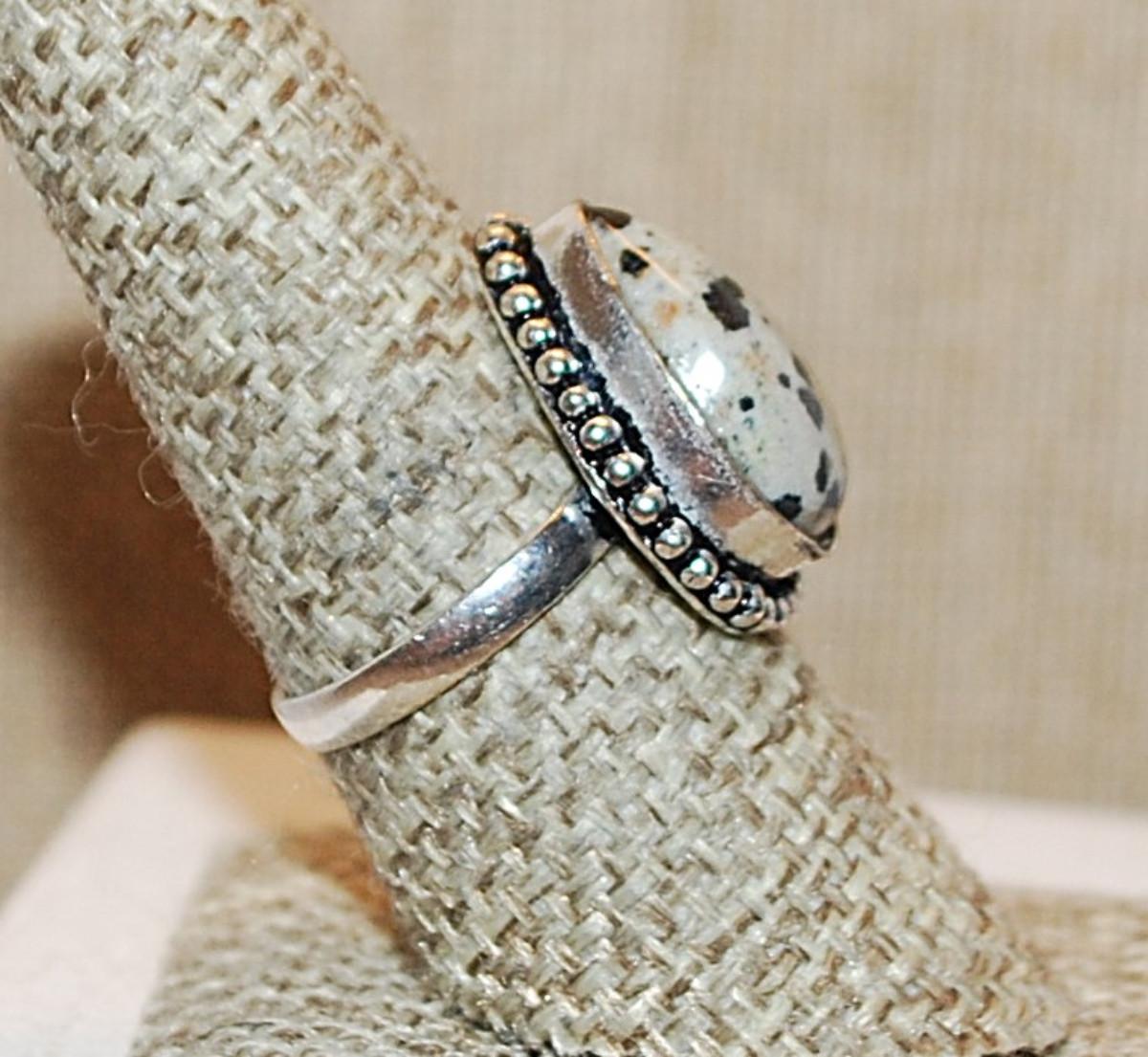 Size 8½ PEAR Shaped Beige & Black DENDRITE OPAL Gemstone Ring with a Full Dimple Surround on a Silver Tone Band (4.7g)