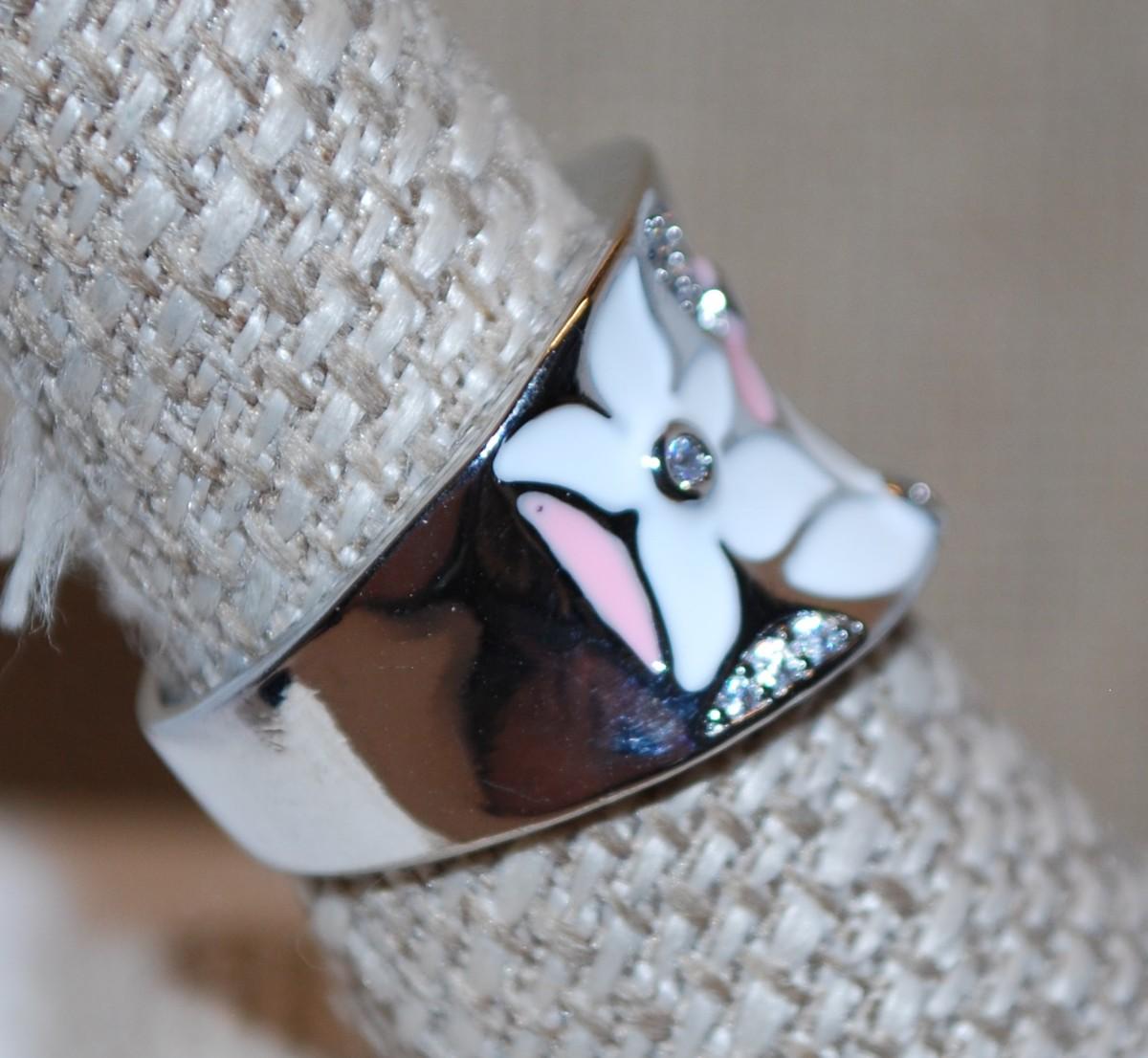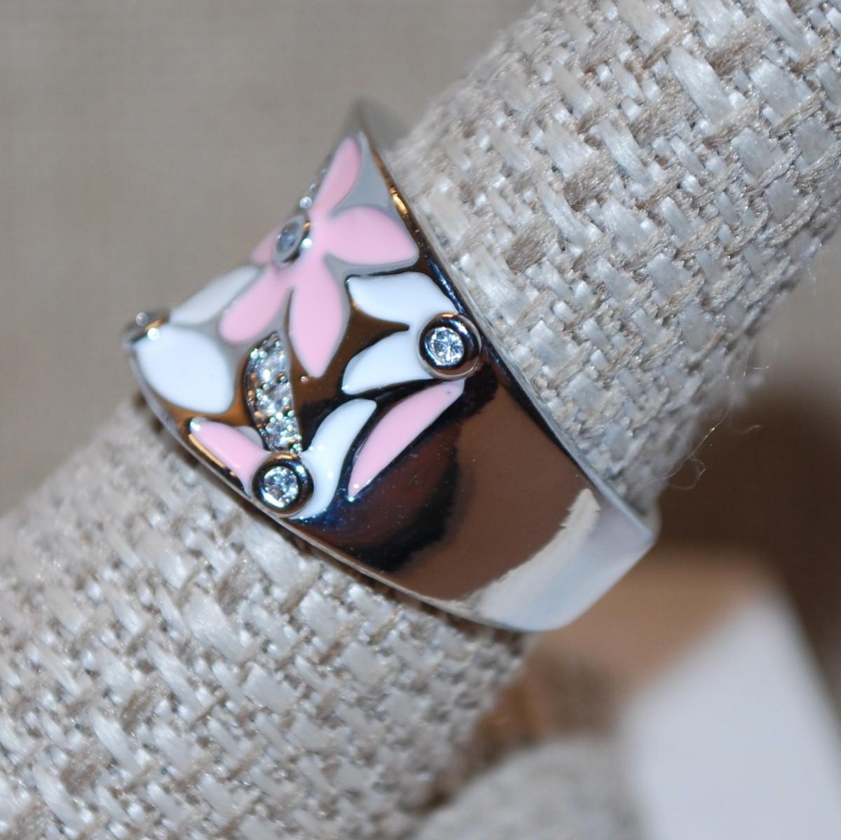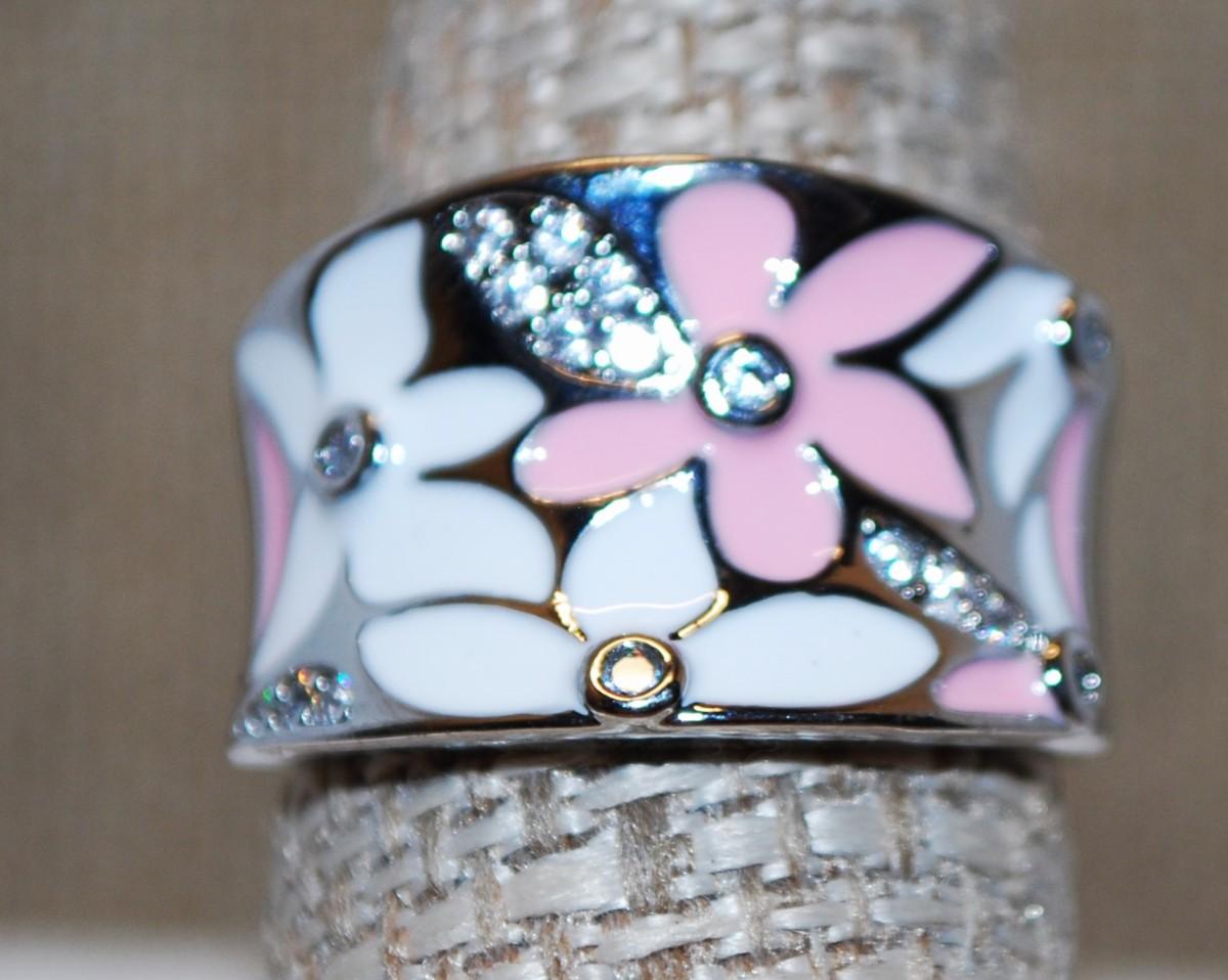 Size 8½ Pink & White Flowers Ring in an Enamel Style on a Silver Tone Band (6.9g)