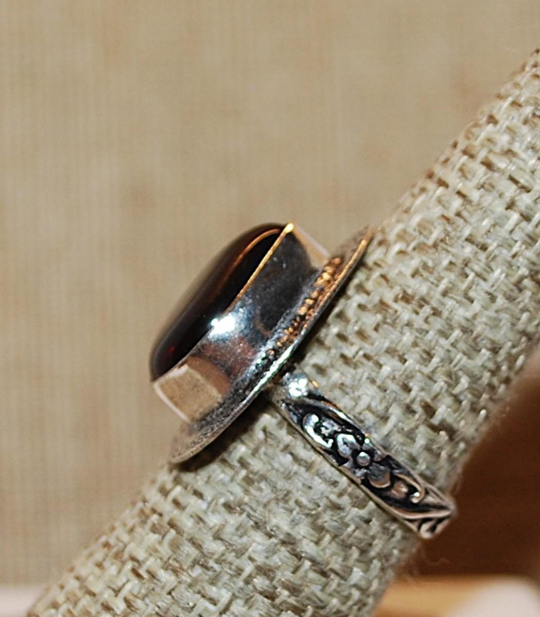 Size 8 RED PEAR GLASS CABOCHON Gemstone Ring with Flat Surround on a Decorative Silver Tone Band (5.2g)