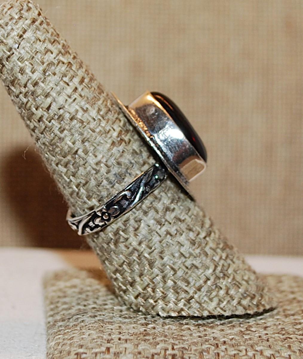 Size 8 RED PEAR GLASS CABOCHON Gemstone Ring with Flat Surround on a Decorative Silver Tone Band (5.2g)