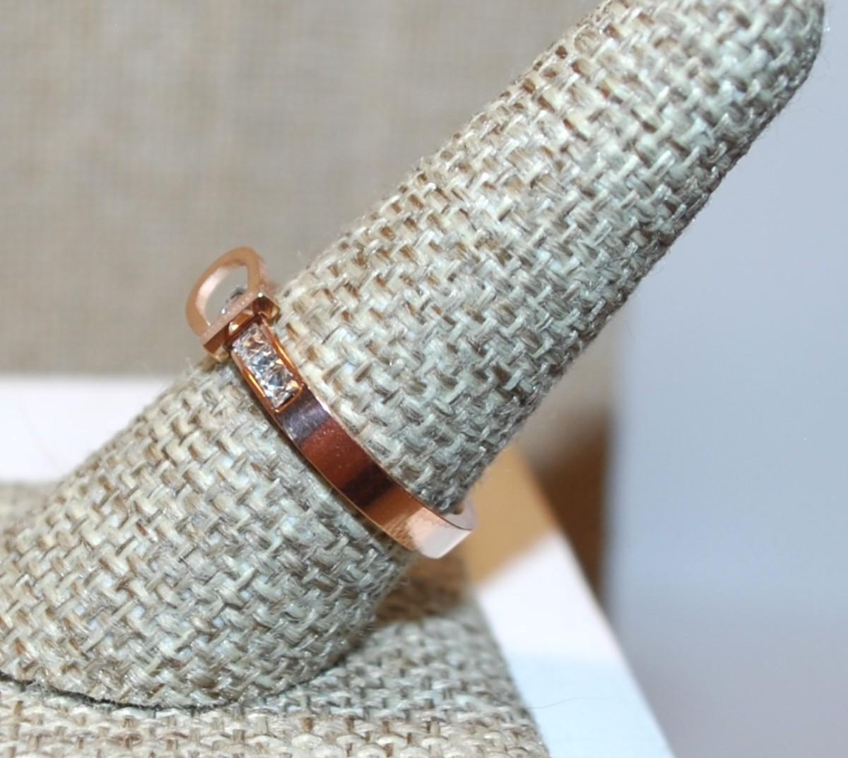 Size 8¼ Rose Gold "Love Forever" Ring with Loop & 7 Square Clear Stone Sides on a Rose Gold Band (2.4g)