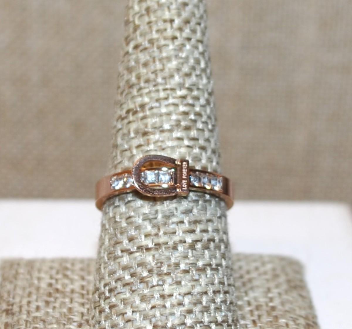 Size 8¼ Rose Gold "Love Forever" Ring with Loop & 7 Square Clear Stone Sides on a Rose Gold Band (2.4g)