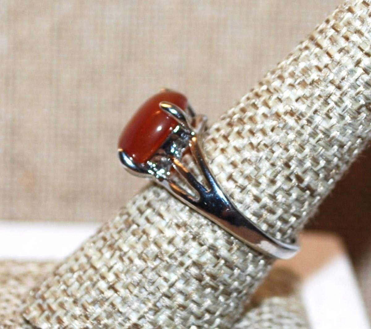 Size 8 Round BLOOD ORANGE Carnelian Stone Ring with 3 Line Side Accents on a Silver Tone Band (3.3g)