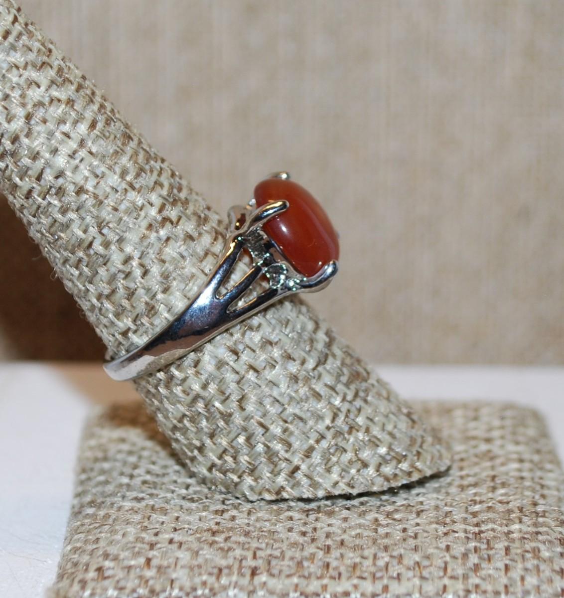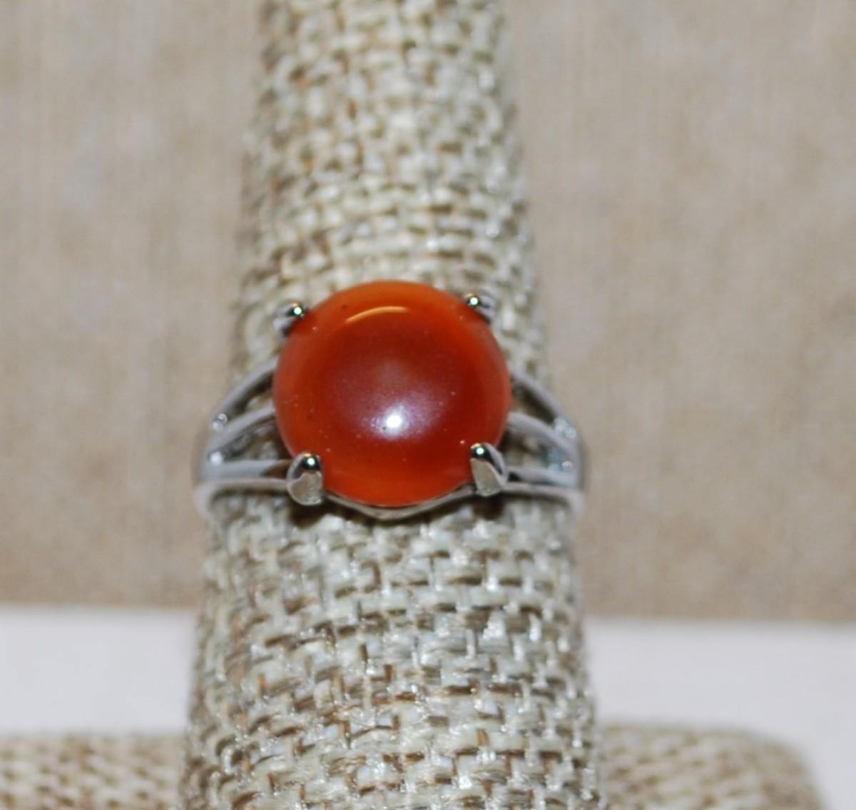 Size 8 Round BLOOD ORANGE Carnelian Stone Ring with 3 Line Side Accents on a Silver Tone Band (3.3g)