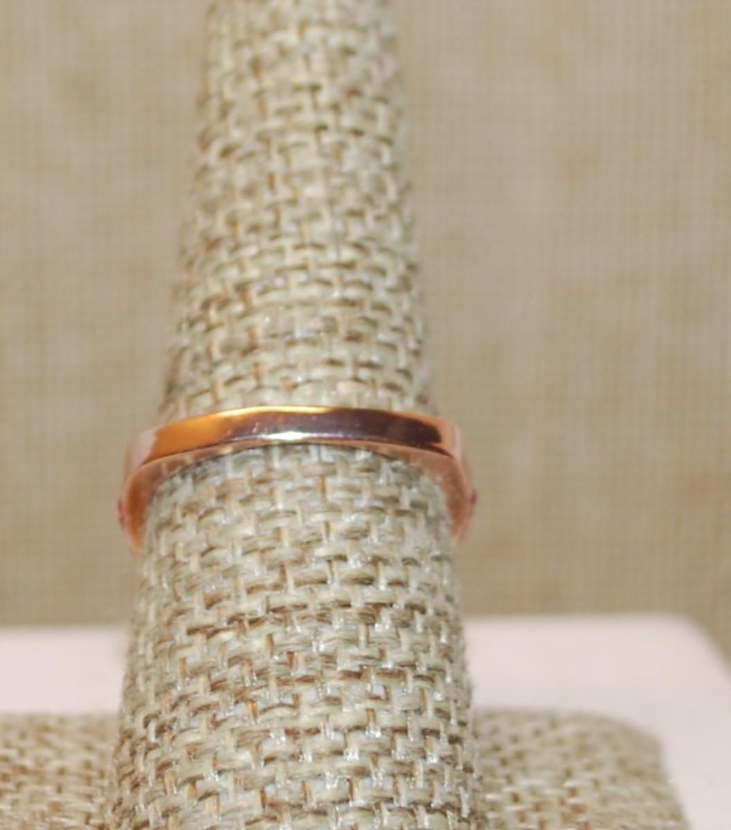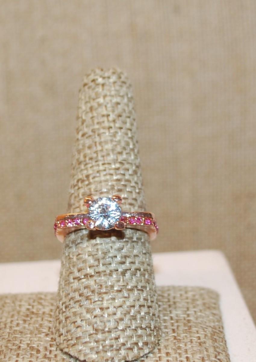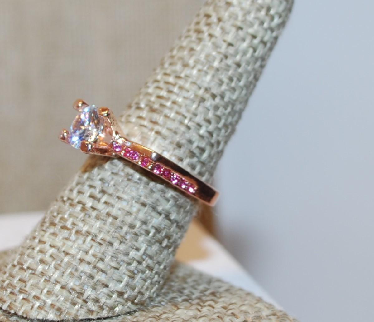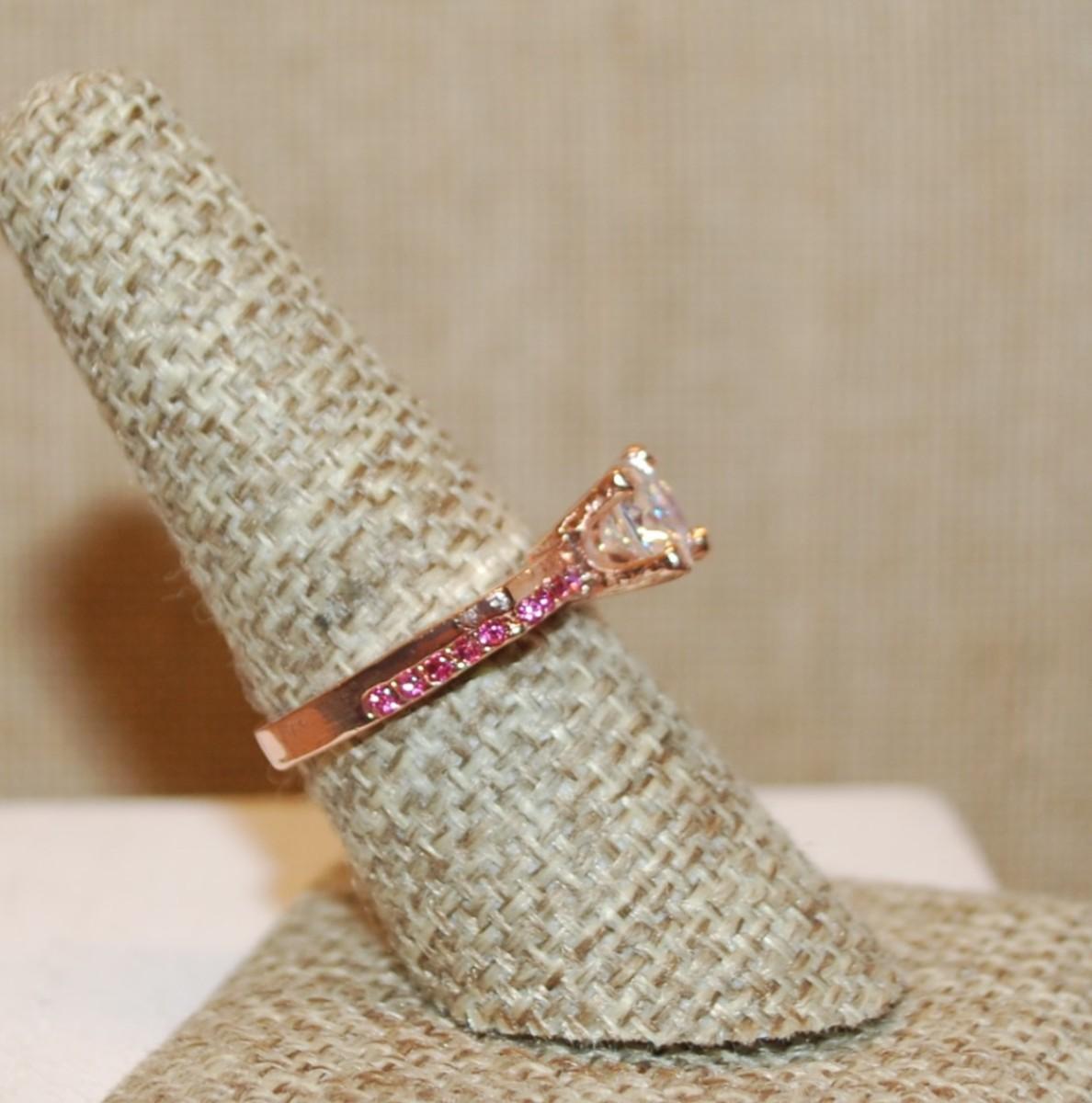 Size 8 Single Round Clear Main Stone Ring with Deep Pink Side Accents on a "Squared" Rose Gold Band (4.3g)