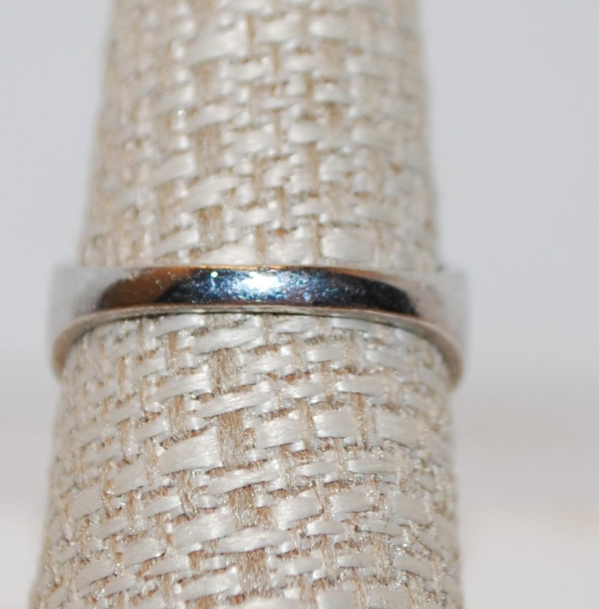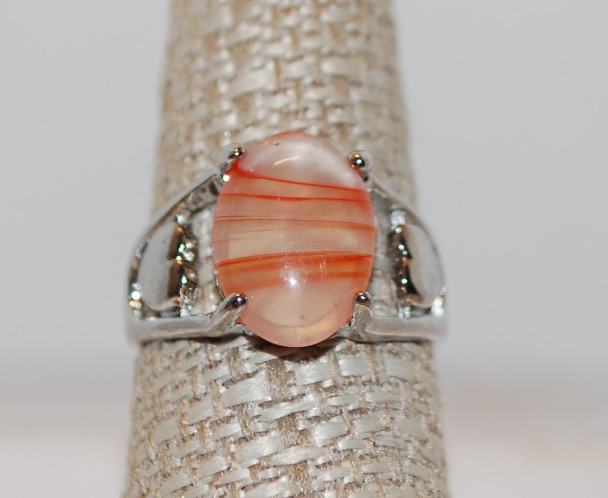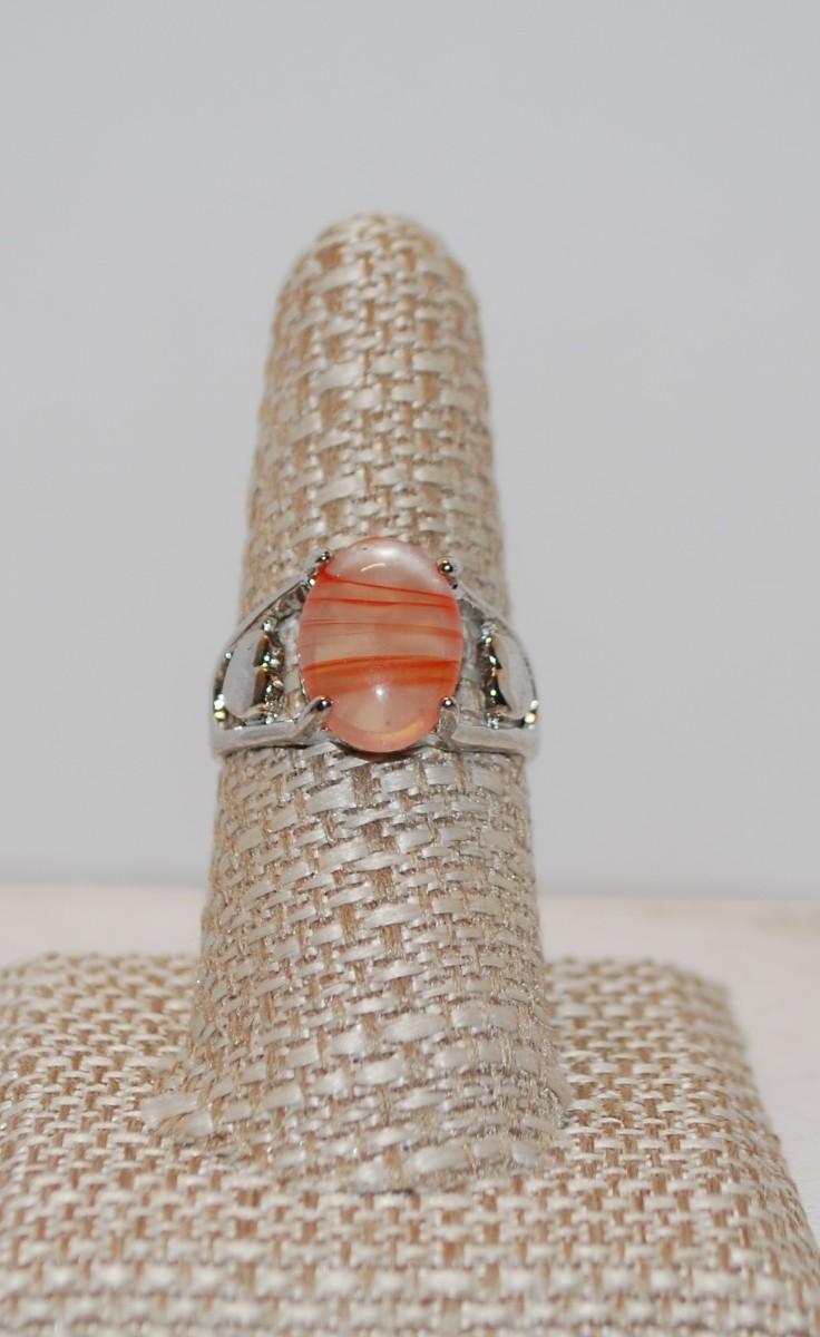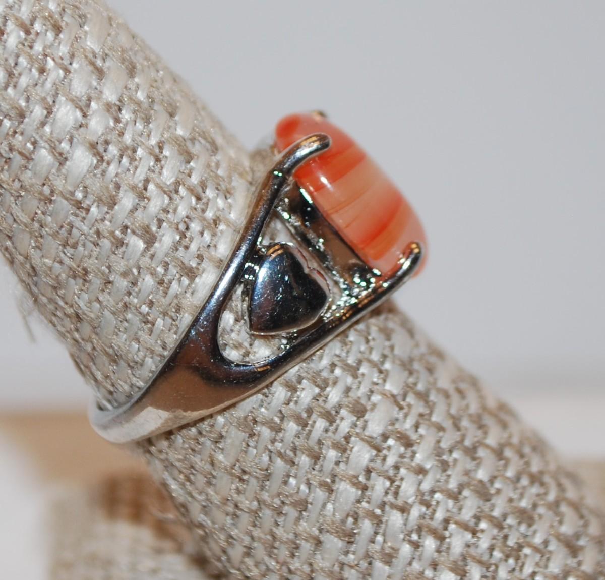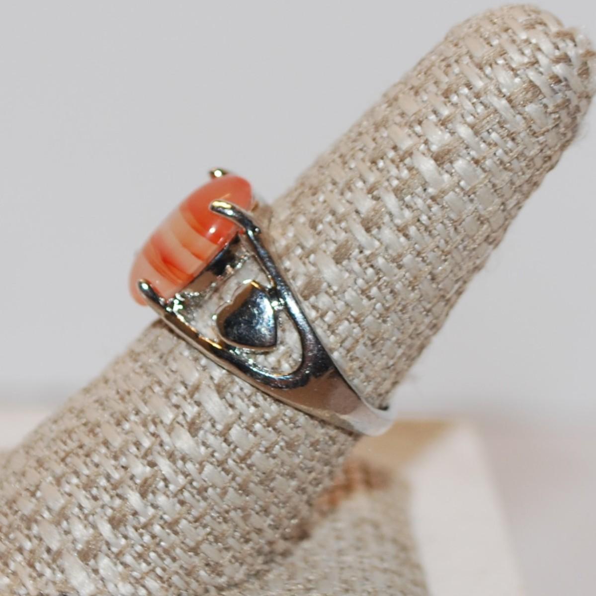 Size 8½ SILVER .925 Orange & Cream Ring with 2 Hearts On Band Design (5.8g)