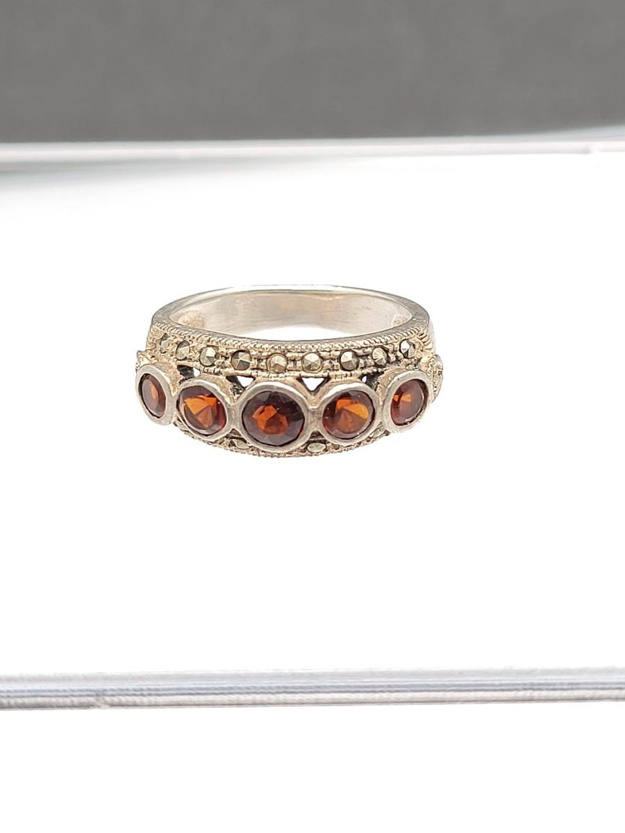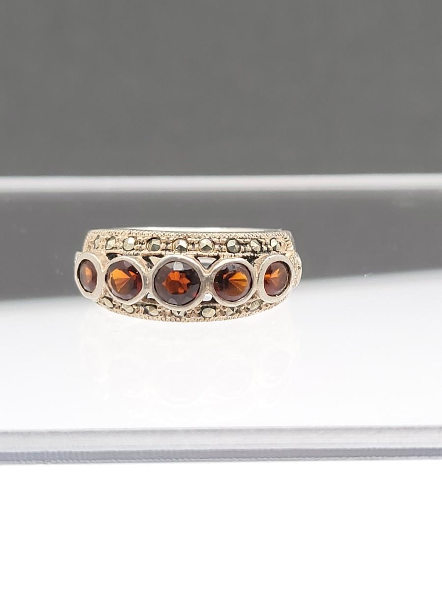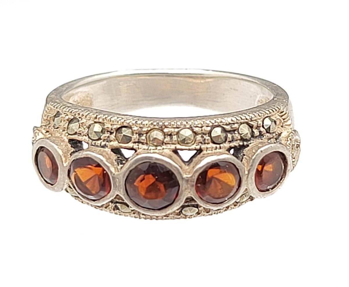 Five garnet stones and marcasite accents, sterling silver band ring, size 8. Weighs 5.1 grams