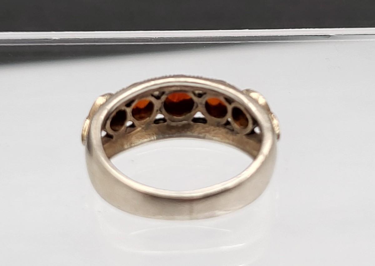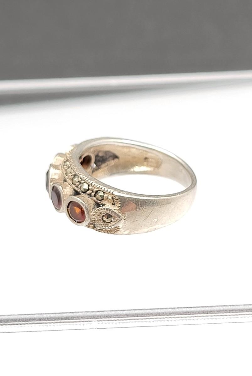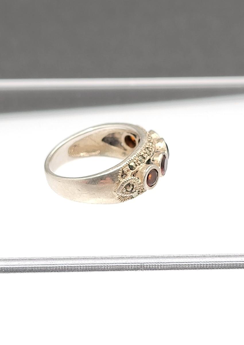Five garnet stones and marcasite accents, sterling silver band ring, size 8. Weighs 5.1 grams
