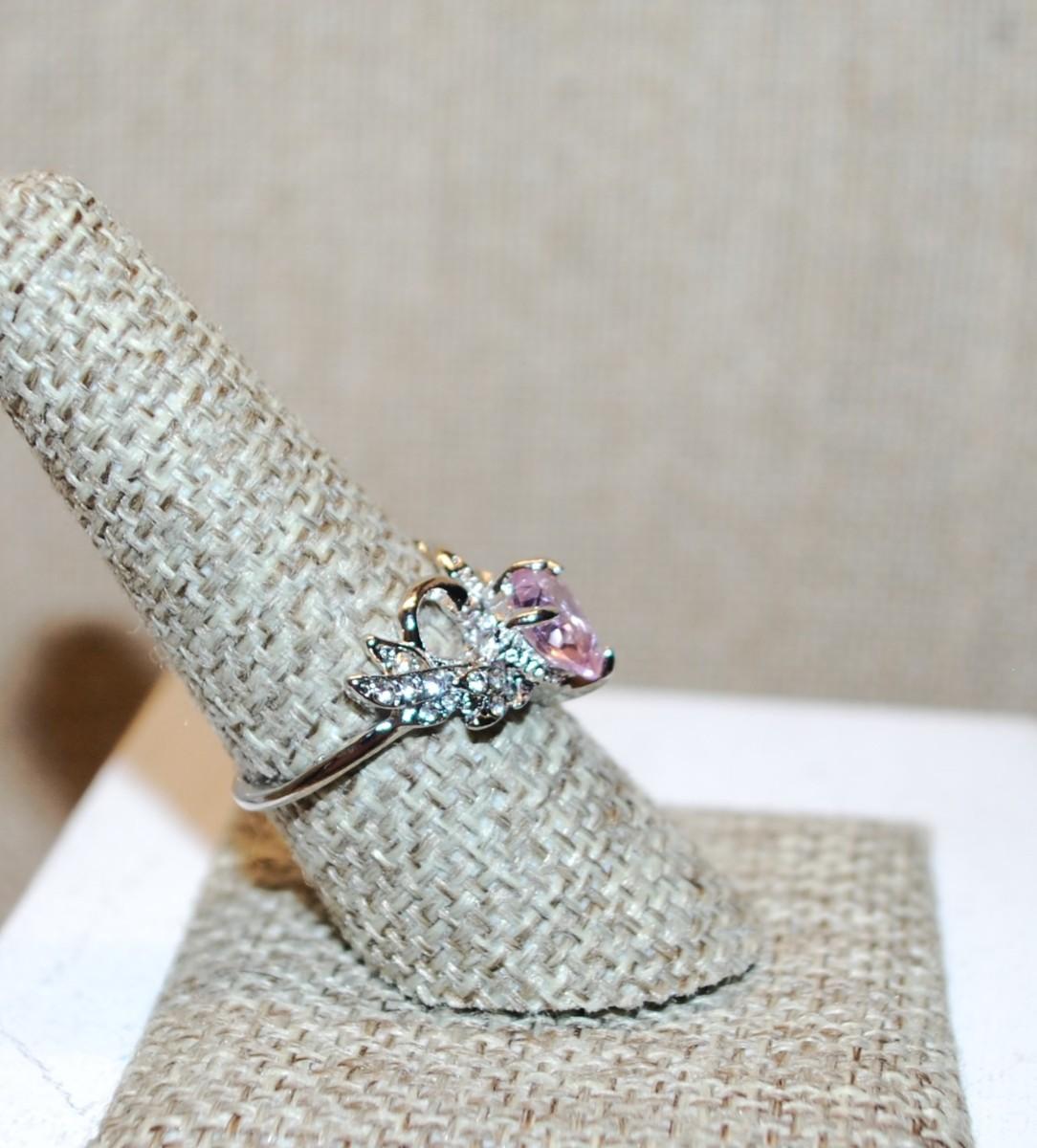Size 8 Transparent Pink HEART Ring with a "Flying Wings" Setting & Silver Tone Band (3.0g)
