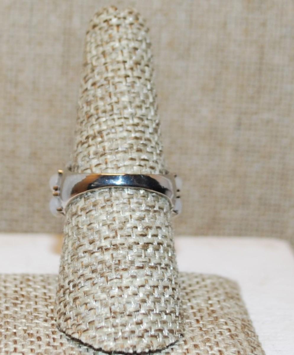 Size 8 White Opal Style Horizontal Side Oval Stones (16) Ring on a Silver Tone Band (4.5g)
